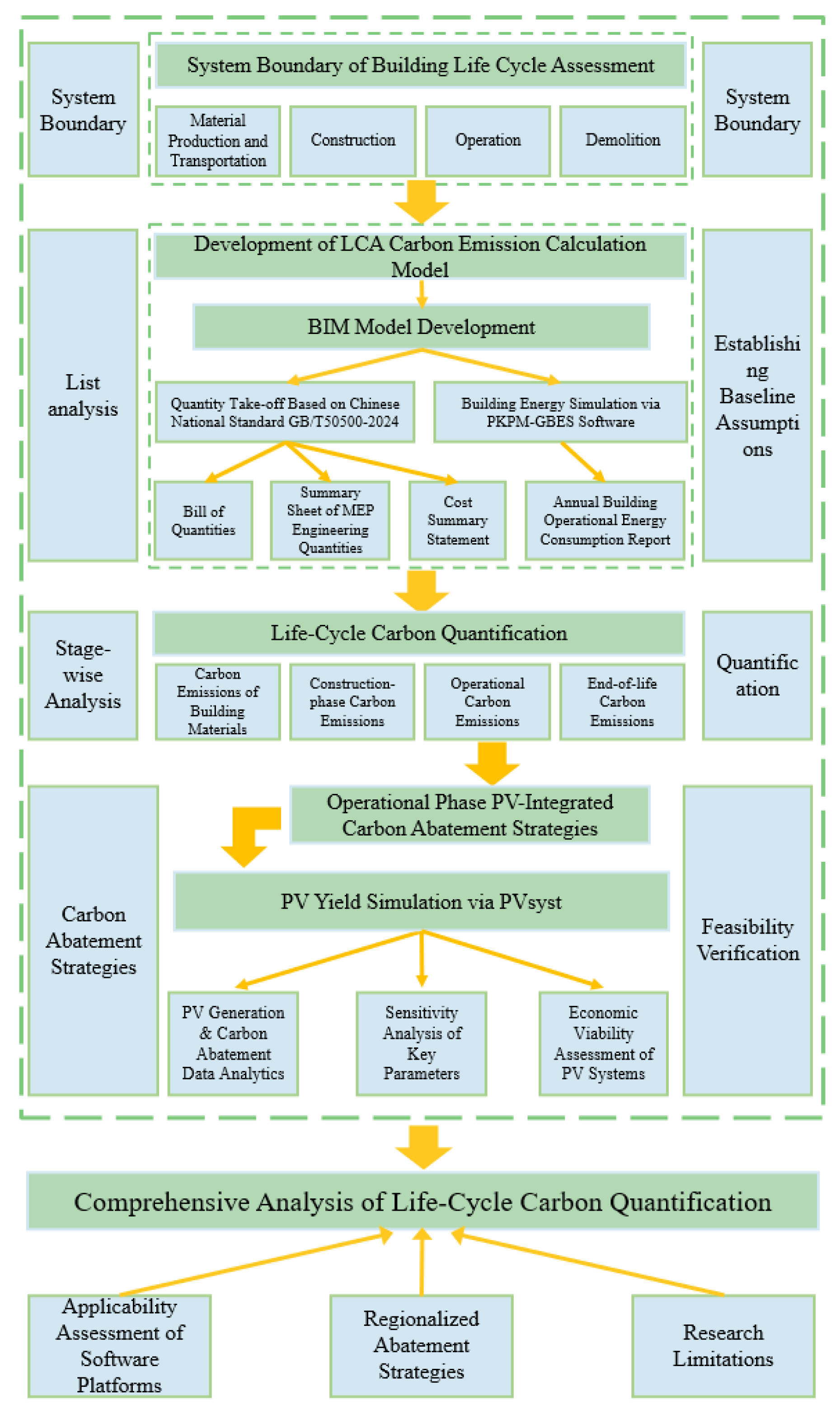 20] employed a LCA approach to calculate the carbon emissions of buildings by integrating relevant indicators, conducting a comprehensive multi-dimensional evaluation of the low-carbon performance of green buildings. The research conducted quantitative analysis across five stages of the building construction process and five evaluation dimensions, establishing a conceptual model for low-carbon assessment of green buildings. Gray relational analysis and the analytic hierarchy process (AHP) were applied to rank and evaluate the projects.