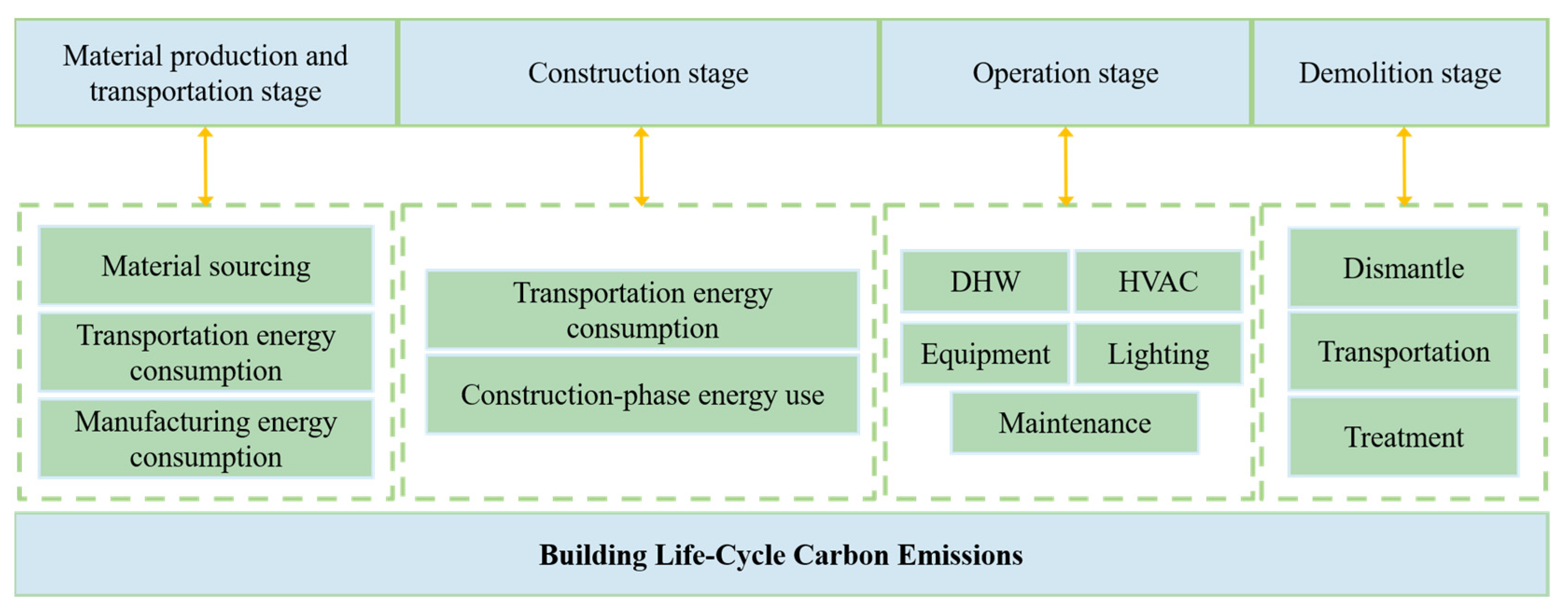 Most studies categorize the calculation of life cycle carbon emissions from buildings into distinct phases: embodied carbon, construction, operation, and demolition. Based on the theory of building life cycle, researchers have developed various methods to construct carbon emission calculation models for conducting comprehensive assessments of carbon footprints over the entire lifespan of buildings.