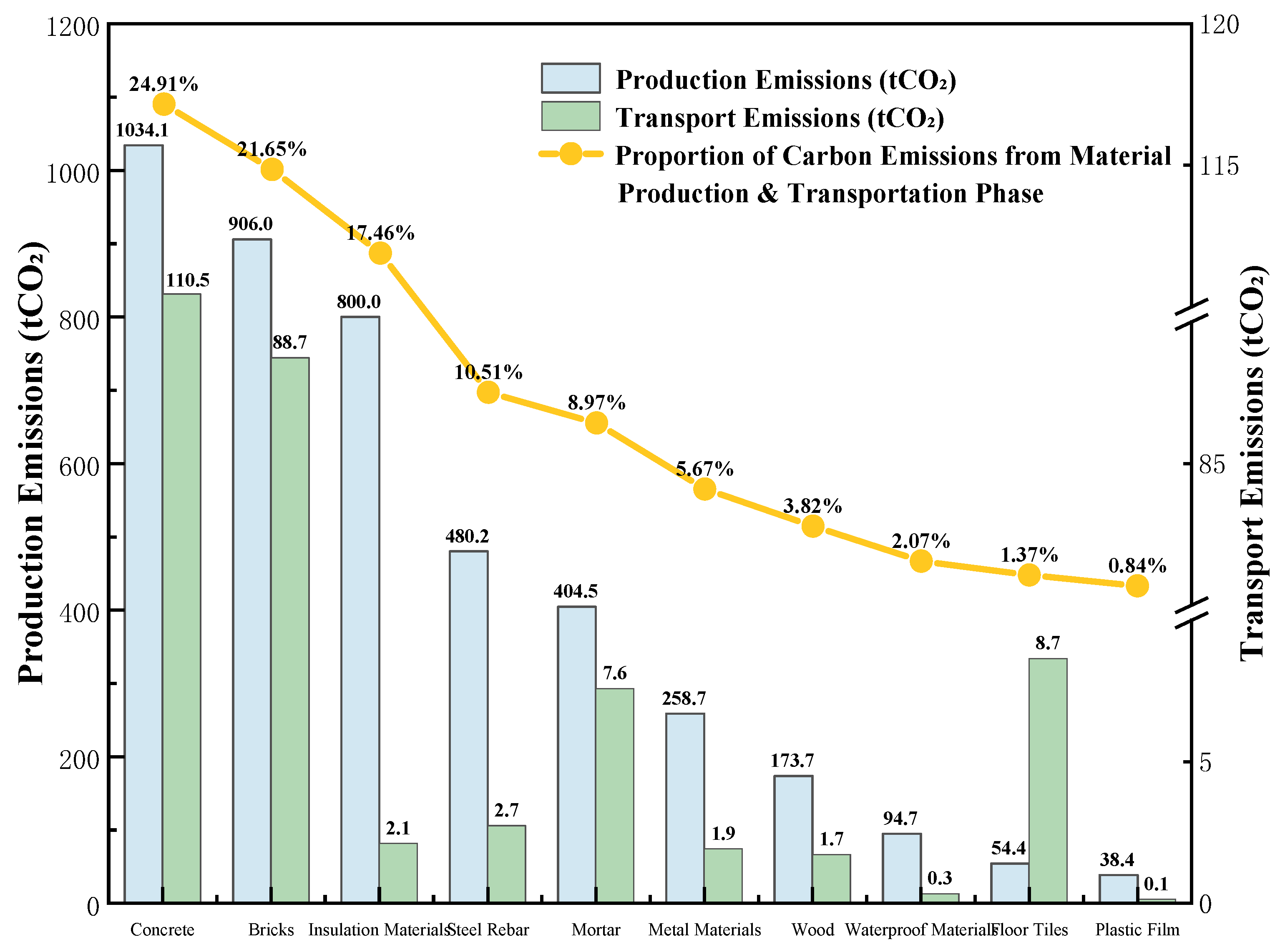 26], targeting the embodied stage of precast concrete composite panel (PCC) projects, integrated LCA, BIM, and Geographic Information System (GIS) technologies to develop a carbon footprint accounting model covering the production, transportation, and installation stages, enabling a quantitative analysis of carbon emission distribution. Case studies revealed a significant negative correlation between the prefabrication rate and carbon emissions per unit area and cost, indicating that increased application of PCC can reduce the carbon footprint by decreasing material consumption.