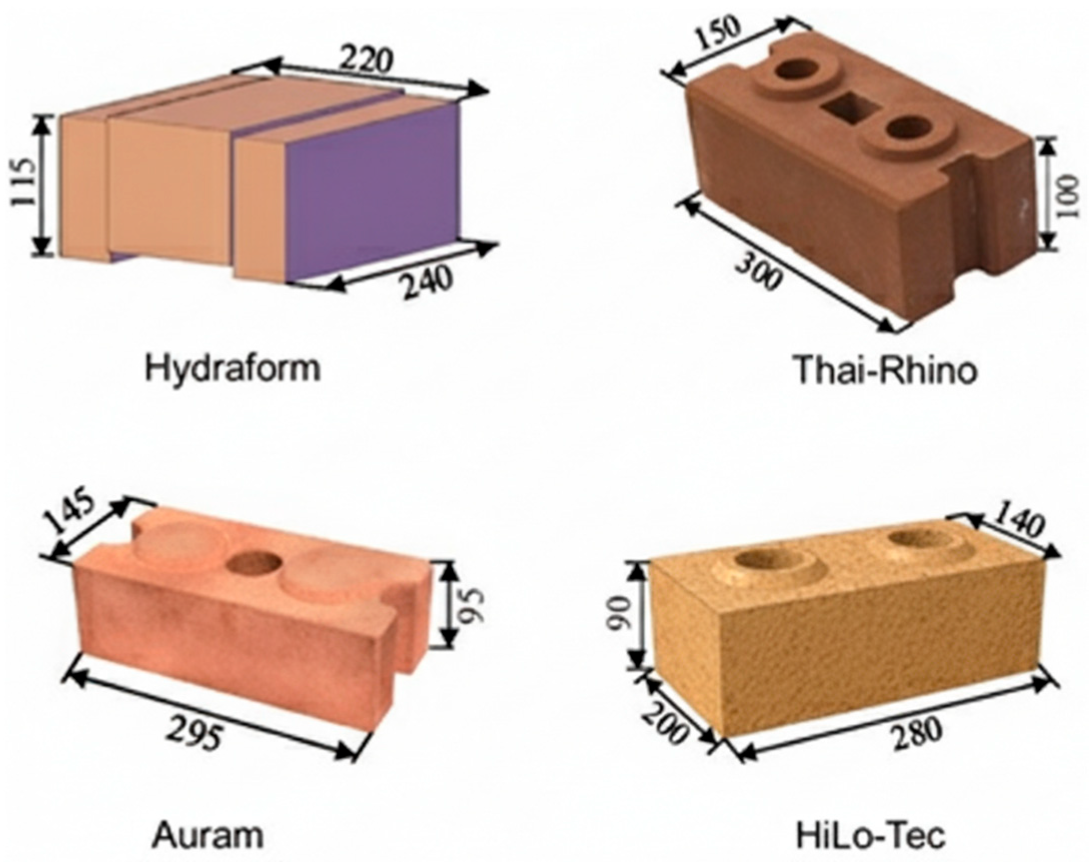 | B—Auram | 295 × 145 × 95 | 6–8 | Groove-and-tongue interlocking key (height ≈ 9 mm) | 1 small central core | Side grooves and chamfered edges enable better finger hold and safe placement | Easy to handle but limited rebar use; esthetic finish preferred for façades |