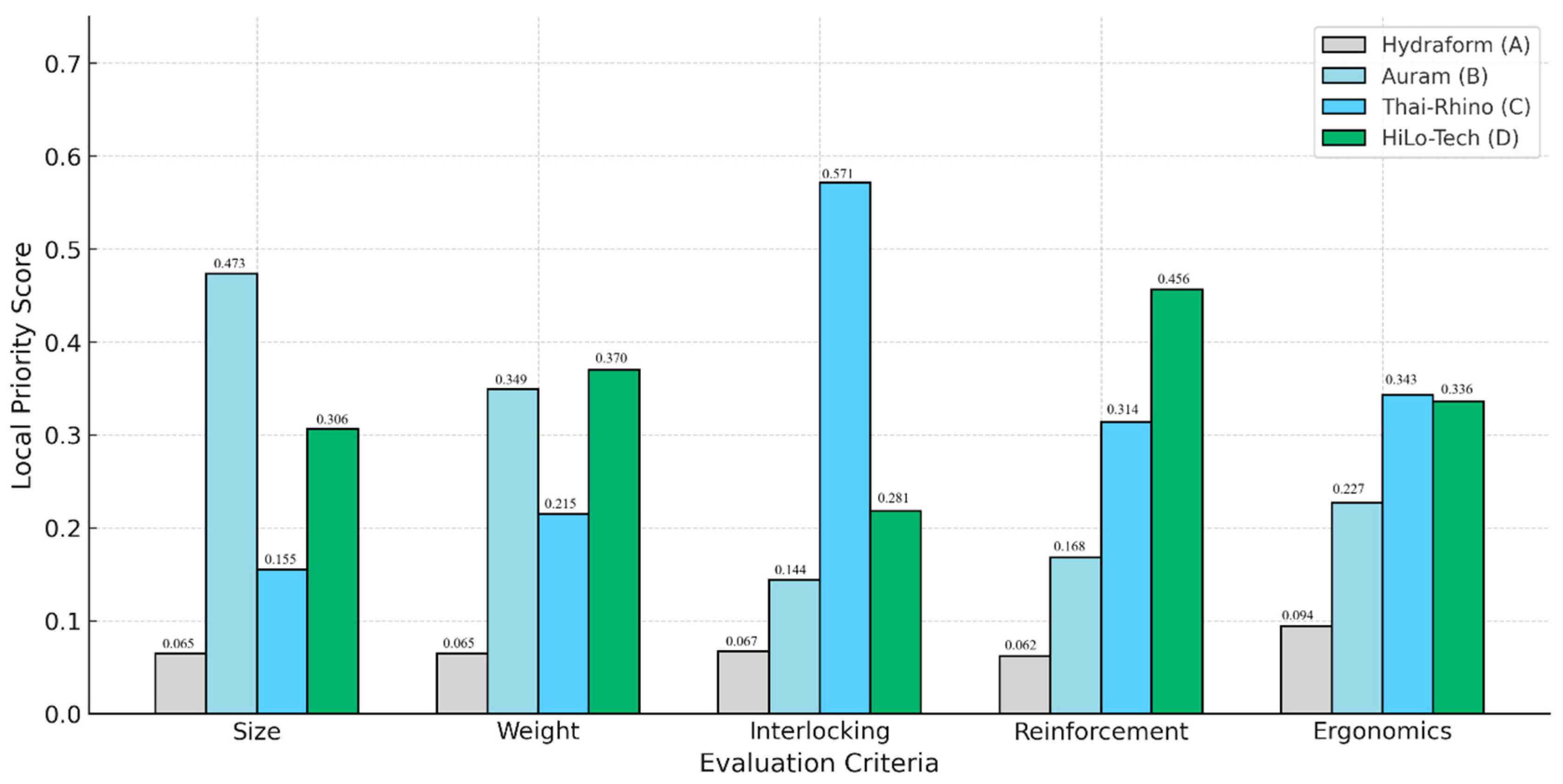 | Criteria | Size | Weight | Interlocking | Reinforcement | Ergonomics | Normalized Weight (wᵢ) |