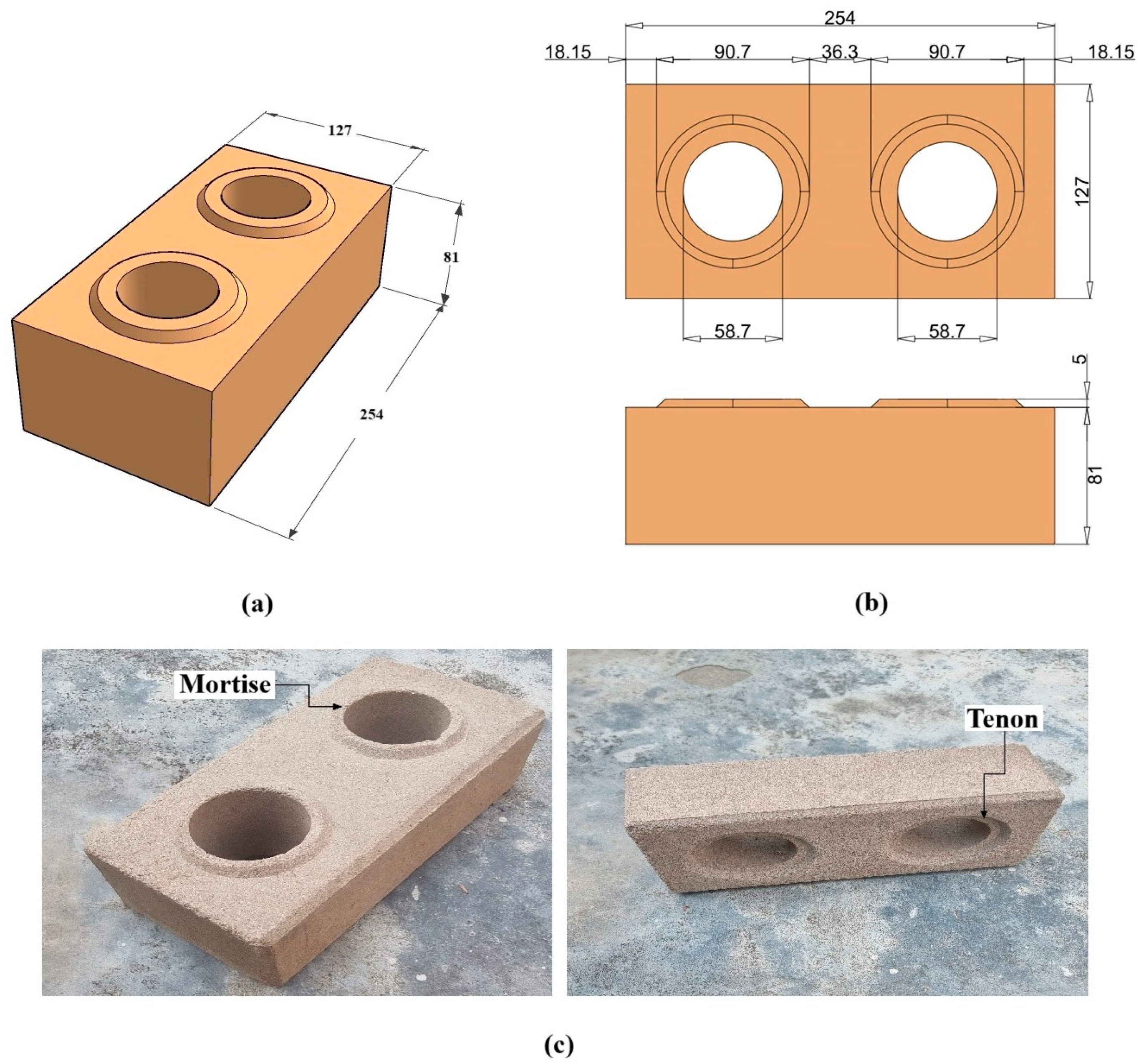 | C—Thai-Rhino | 300 × 150 × 100 | 6–8 | Dual keys (height ≈ 12 mm) providing a strong mechanical fit | 2 cores + groove | Side grooves, chamfered | Secure interlock, good seismic fit, but reduced net area |