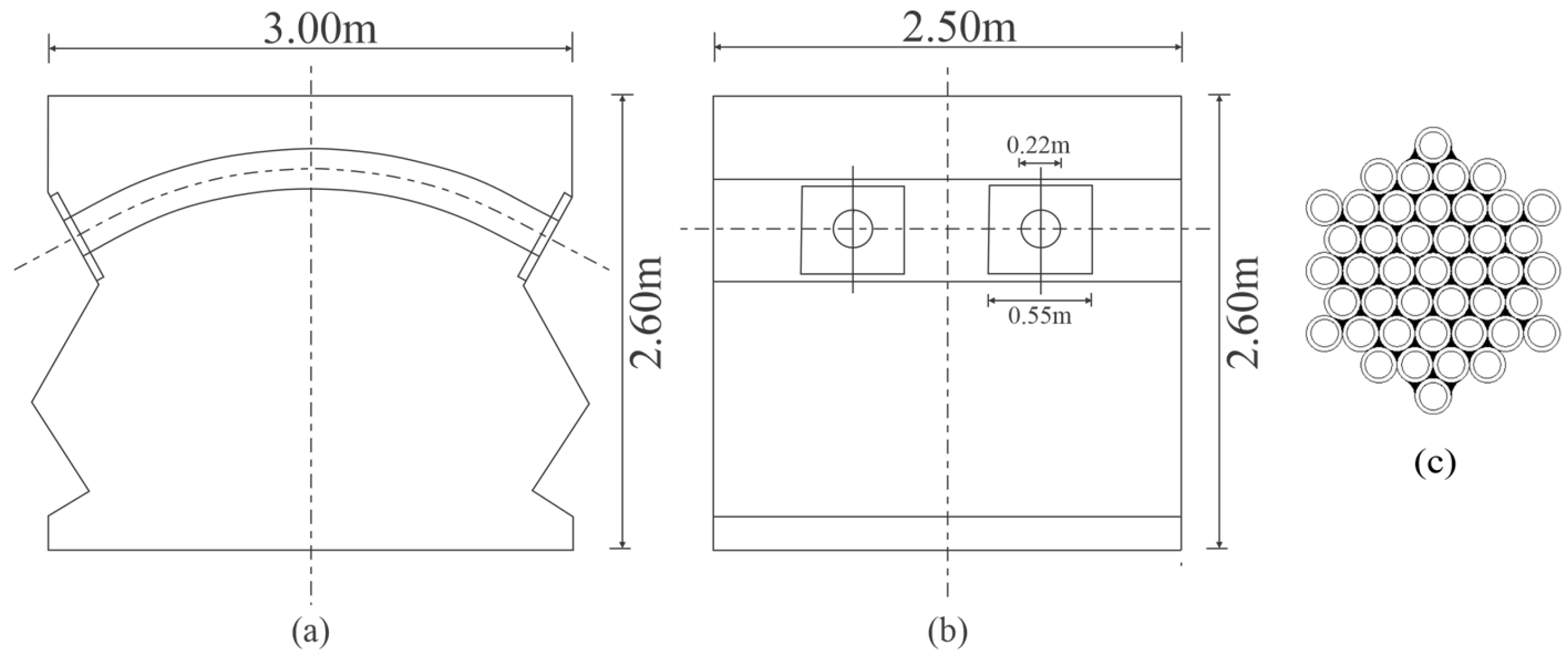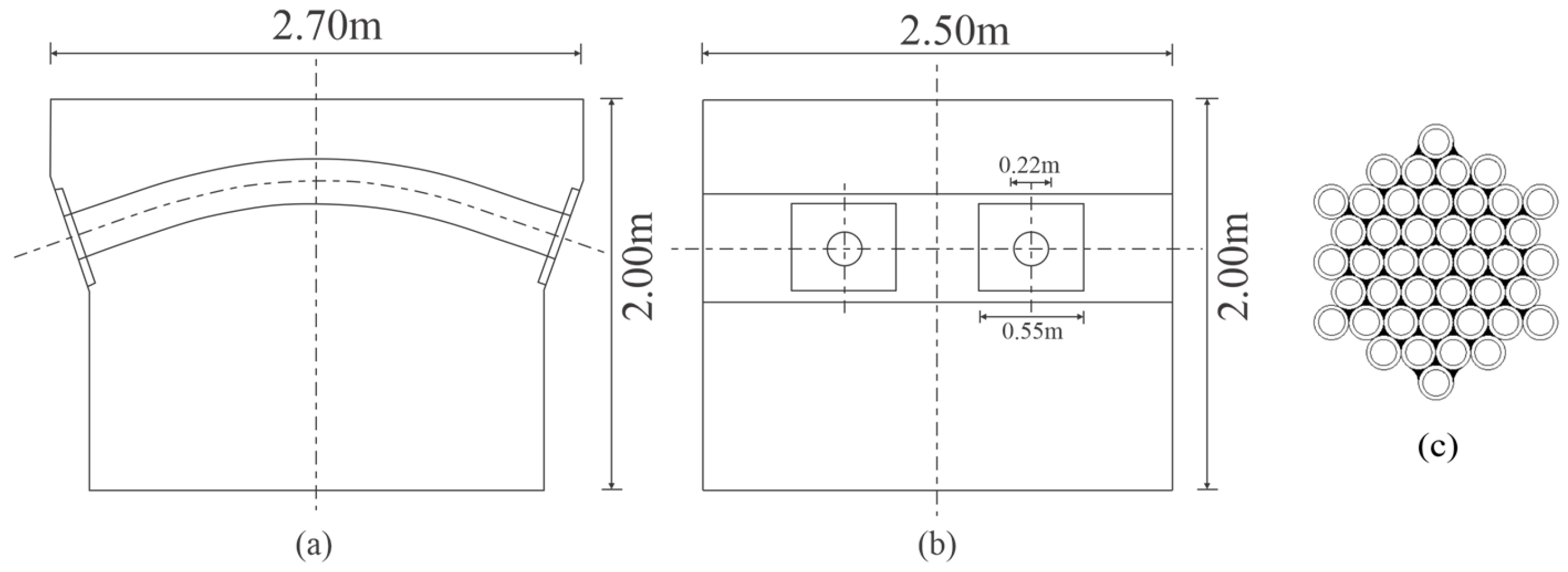 Figure 3. Geometry dimensions for the filament pipe anchorage zone segment in Model 1: (a) elevation section, (b) side section, and (c) filament pipes.