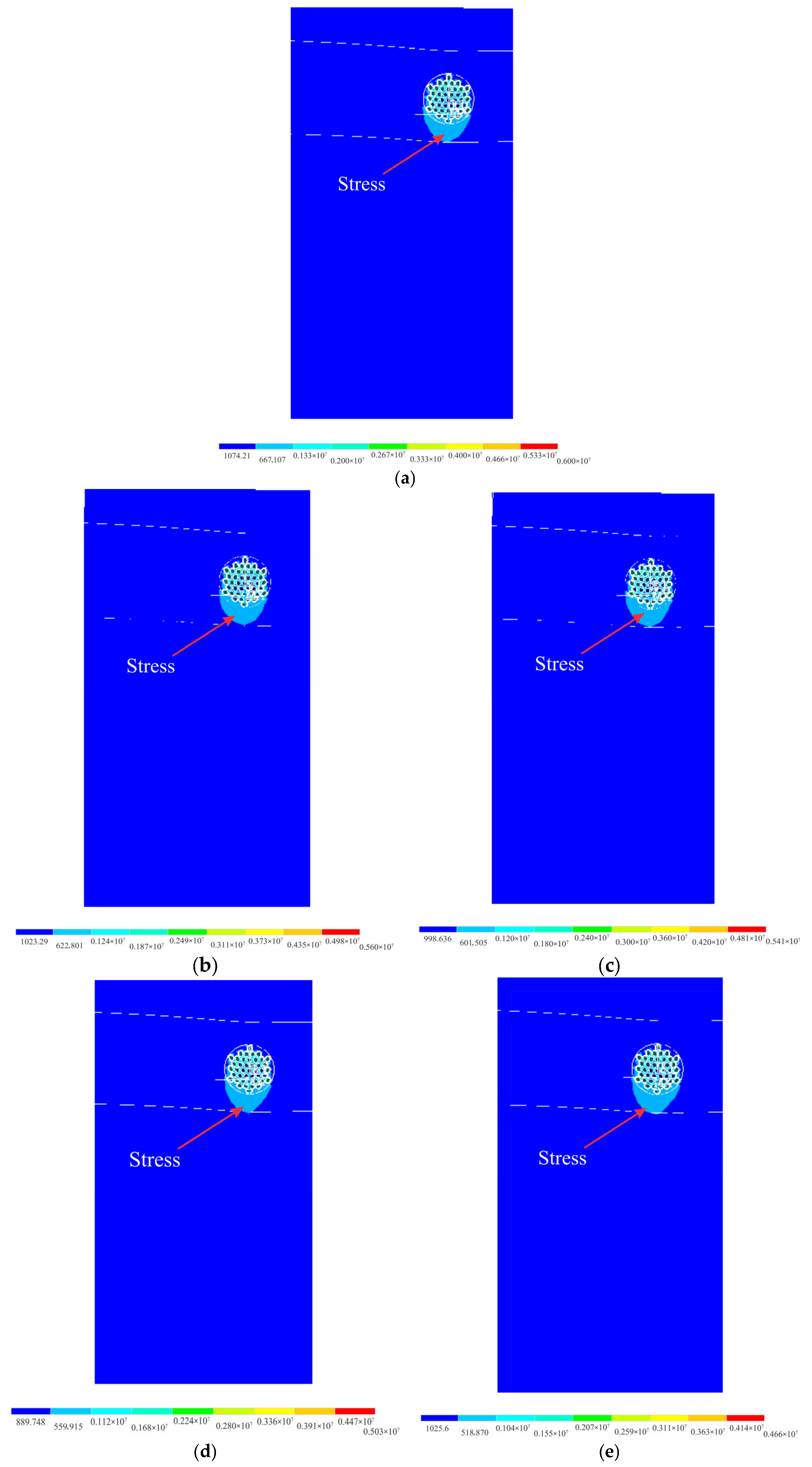 The results presented in Figure 8 show that as the cable-saddle curvature radius increased from 2.1 m (Model A) to 2.7 m (Model E), the maximum von Mises stress within the concrete tower decreased markedly, from approximately 6 MPa to 4.66 MPa. This trend indicates that increasing the curvature radius reduces the stress concentration in the anchorage zone. A flatter saddle entry promotes a smoother load transfer path between the cable and the surrounding concrete, thereby lowering the shear–compression interaction near the filament pipe and reducing the risk of cracking initiation in this region. This confirms that curvature radius is a governing geometric parameter in controlling stress demand in the anchorage zone.