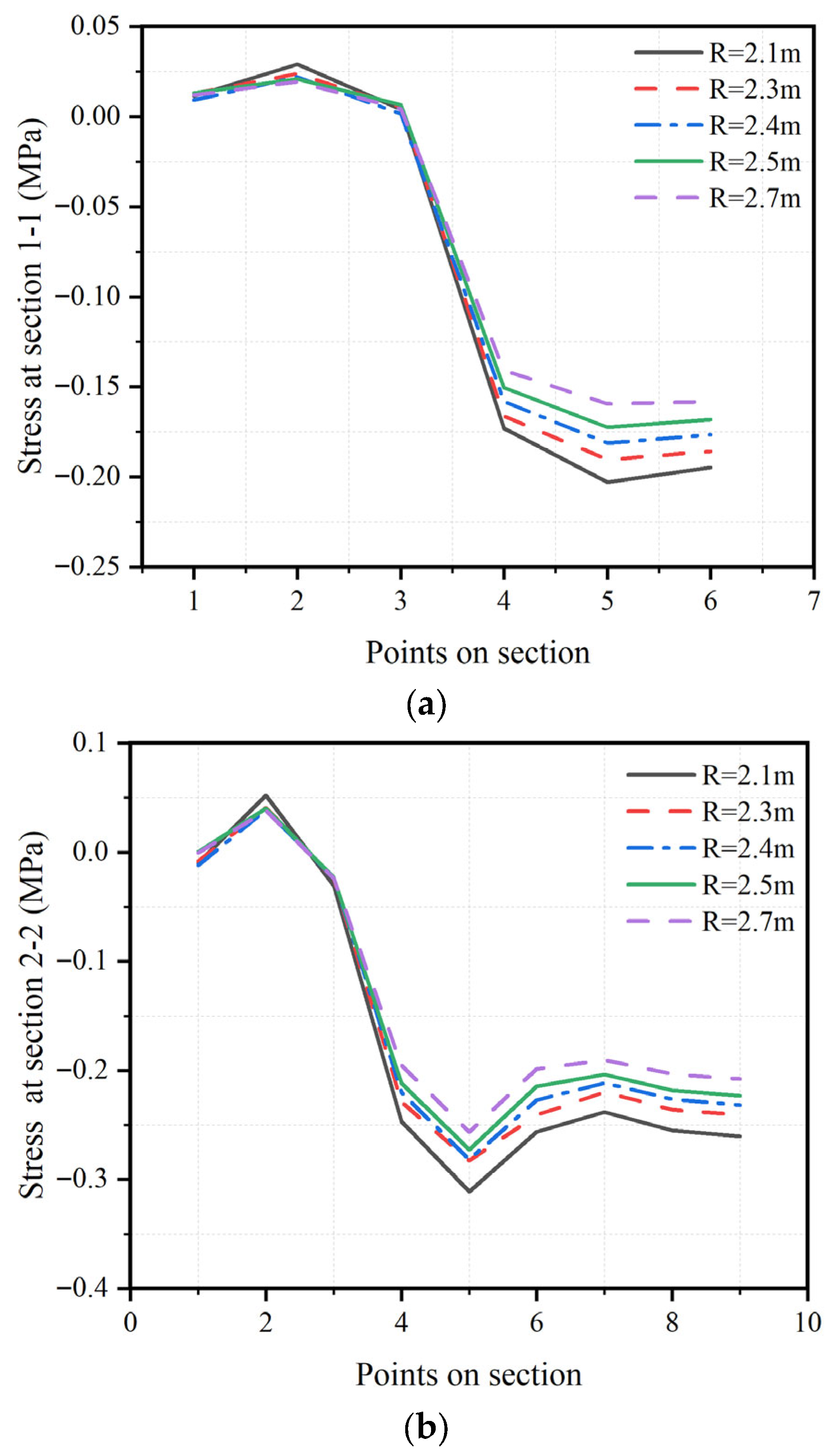 Figure 9 presents the stresses in Sections 1-1, 2-2, and 3-3. The results showed that Section 1-1, situated far from the tower’s center, had minimal stress. Additionally, the stress within this section varied based on the location of the point, with vertical stress being dominant. However, only a small amount of horizontal stress was observed. The first three points correspond to horizontal stress. Thus, a small level of horizontal stress existed. The vertical stress on the concrete increased as the closer the point is to the center of the tower. Similarly, the model with a smaller radius of curvature exhibited higher stress. This result indicates that as the radius increases, the stress on the concrete decreases, and vice versa. Section 1-1 had a high stress at location A5. Section 2-2 (B1–B9) and Section 3-3 (C1–C10) exhibit a similar pattern, with vertical stress dominating and the highest stress at the point closest to the center of the tower. In addition, the stress for a smaller radius of curvature was high across all sections. Section 2-2 had a high stress at location B5, whereas Section 3-3 had a high stress at location C8.