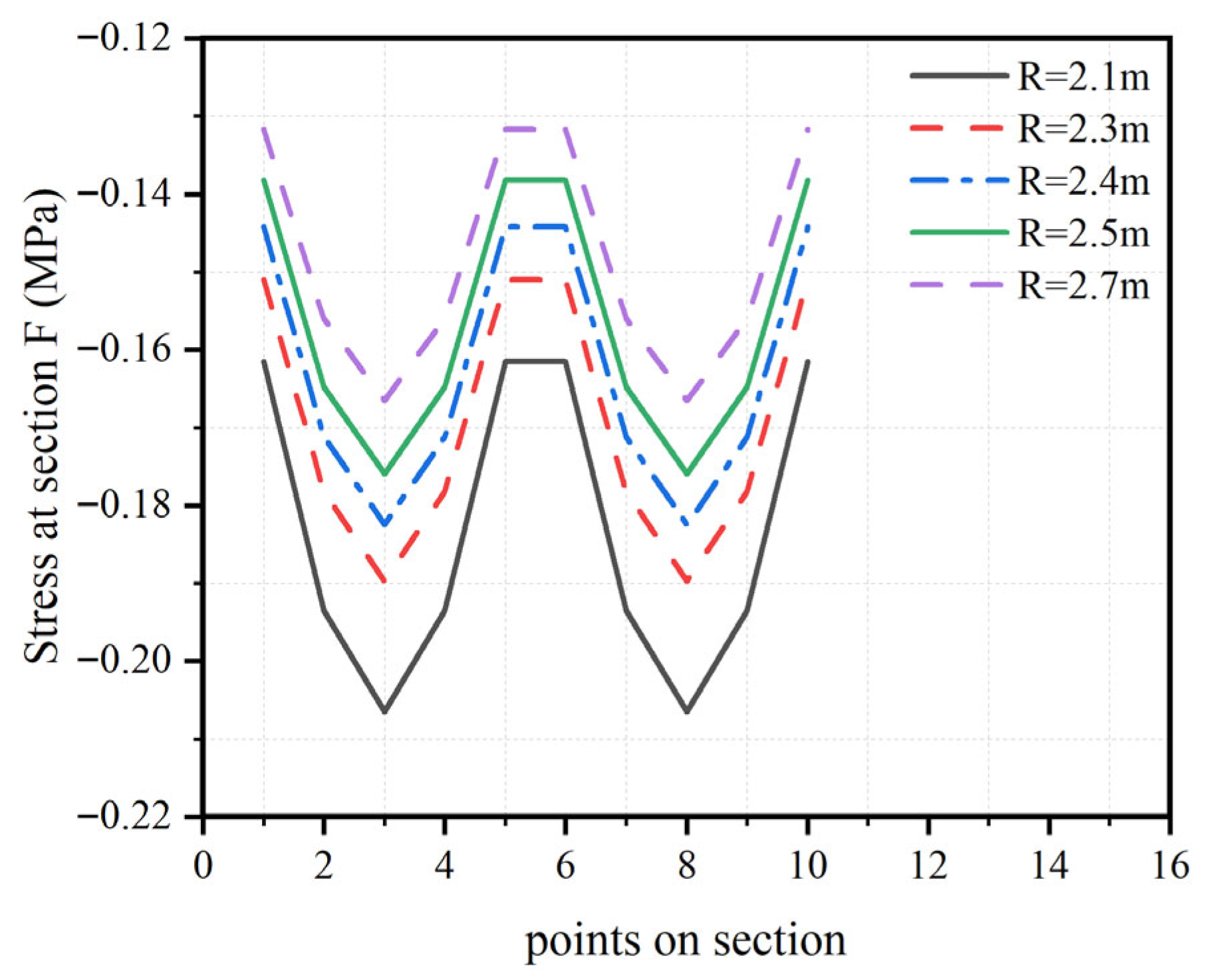 Model 1 was used to investigate the impact of the radius of curvature of the cable saddle (R) on stress variations. In this study, different areas within the concrete beneath the cables were examined. Figure 6 and Table 3 present the parameters studied.