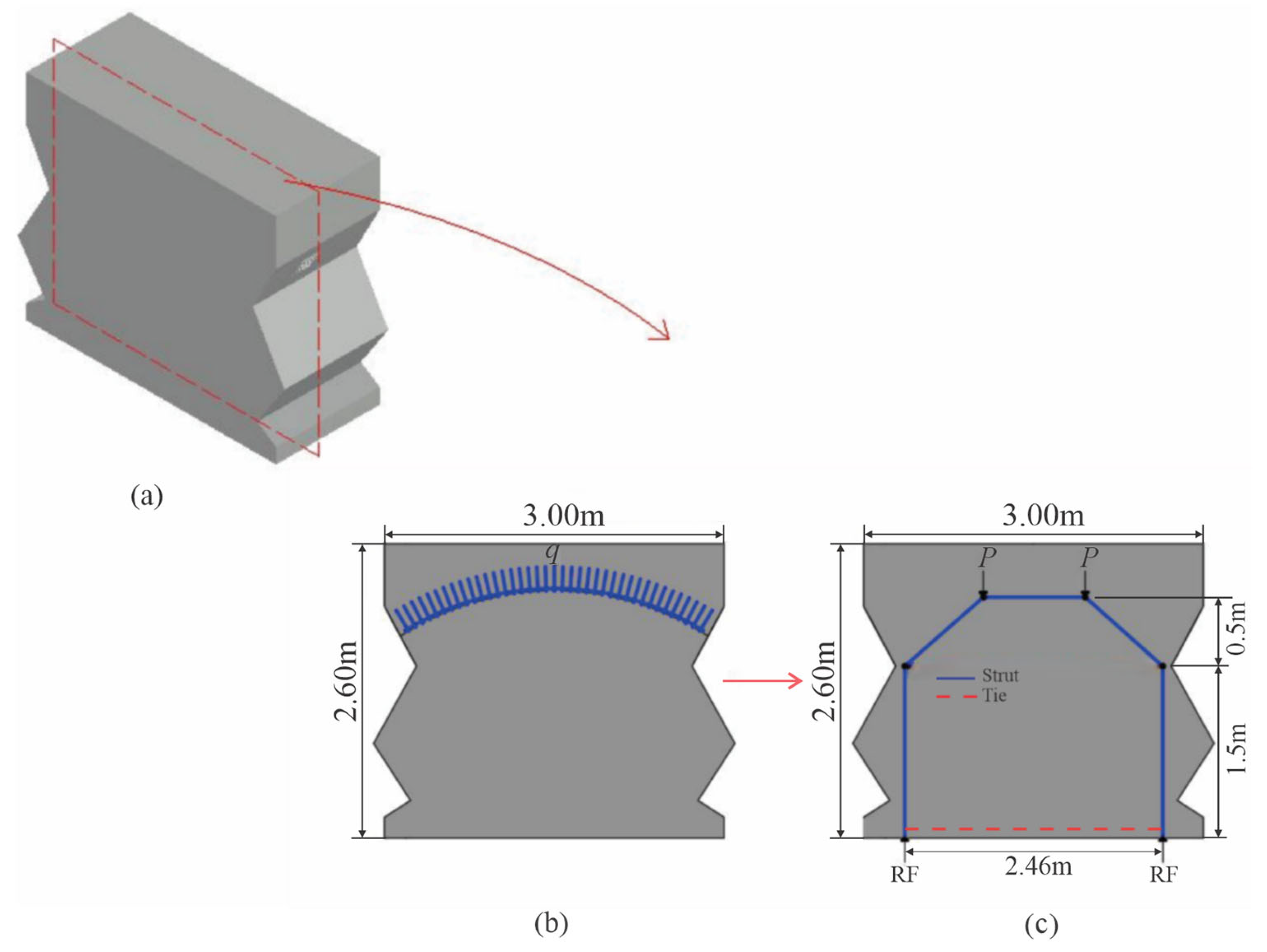 Figure 13. Strut-and-tie model (STM): (a) 3D modelling; (b) section elevation with distribution load and (c) optimal STM.