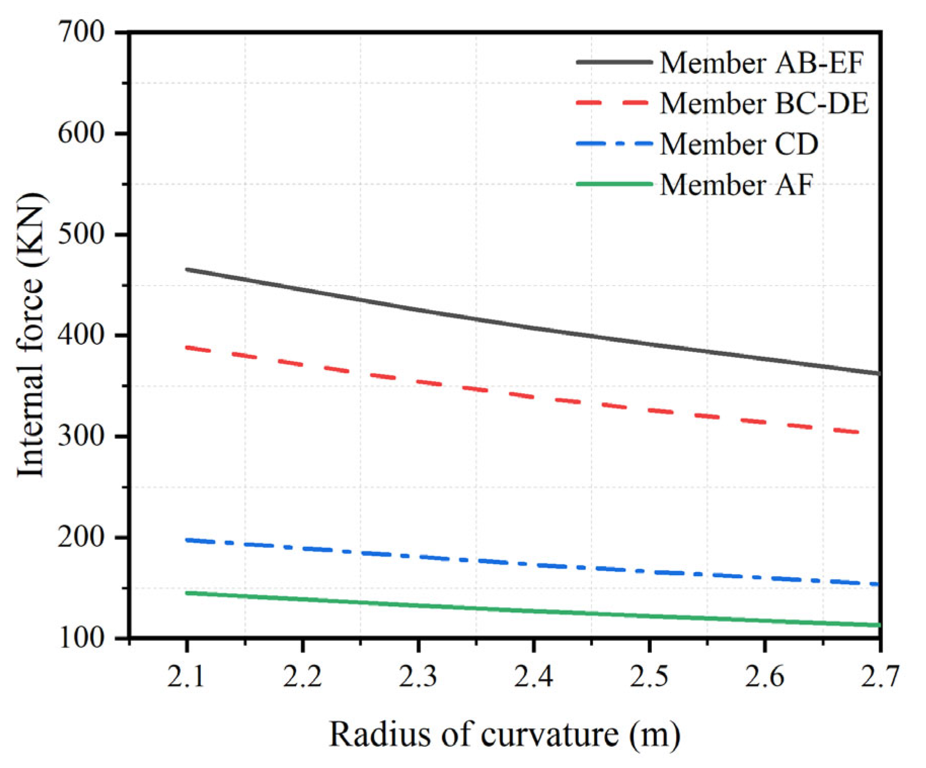 Figure 14 provides a detailed illustration of the internal forces acting on STM members for various radius of curvature (R), showing how the force distribution changes with R. Figure 15 illustrates the internal force in STM members as a function of the radius of curvature (R), highlighting how the force distribution evolves with changes in R. As R increases, the internal force in the members decreases. The applied force (P), varying with R, is calculated using Equation (1). This finding also supports the conclusion drawn from the stress-section curves for Sections 1-1, 2-2, 3-3, S, and F in Model 1, namely, that increasing R leads to a reduction in stress.
