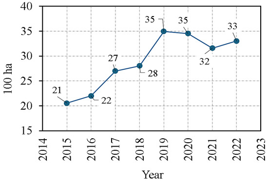 Graph of the EU land area used for hemp cultivation, adapted from [34].
