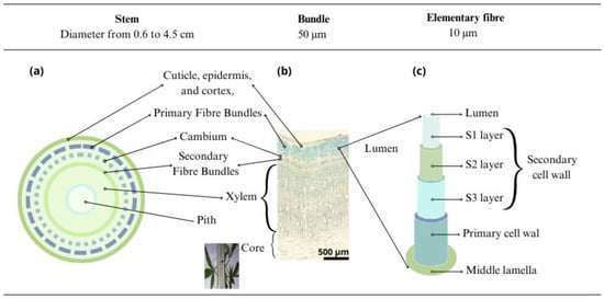 Hemp fibre structure: (a) cross-section of hemp fibre stem, (b) cross-section morphology of the hemp fibre bundle, and (c) schematic depiction of hemp elementary fibre [2,30,35,42,43].