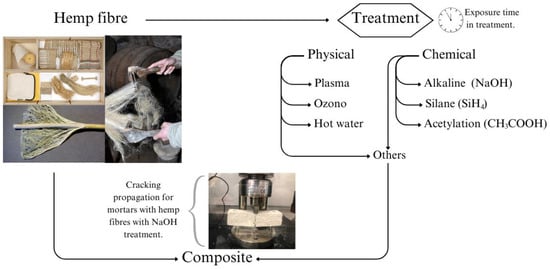 In natural fibre-reinforced polymer composites, the interface and its properties significantly influence the interfacial bonding between the fibre and matrix, and, consequently, the resulting properties. The interaction mechanism at the interface is complex, considering factors such as interface thickness, surface energies, and wetting phenomena. Surface modification of fibres to enhance compatibility with the polymer matrix can be achieved through two approaches: (i) chemical methods and (ii) physical methods [35]. Figure 4 presents an overview of hemp fibre treatments for use in composites.
