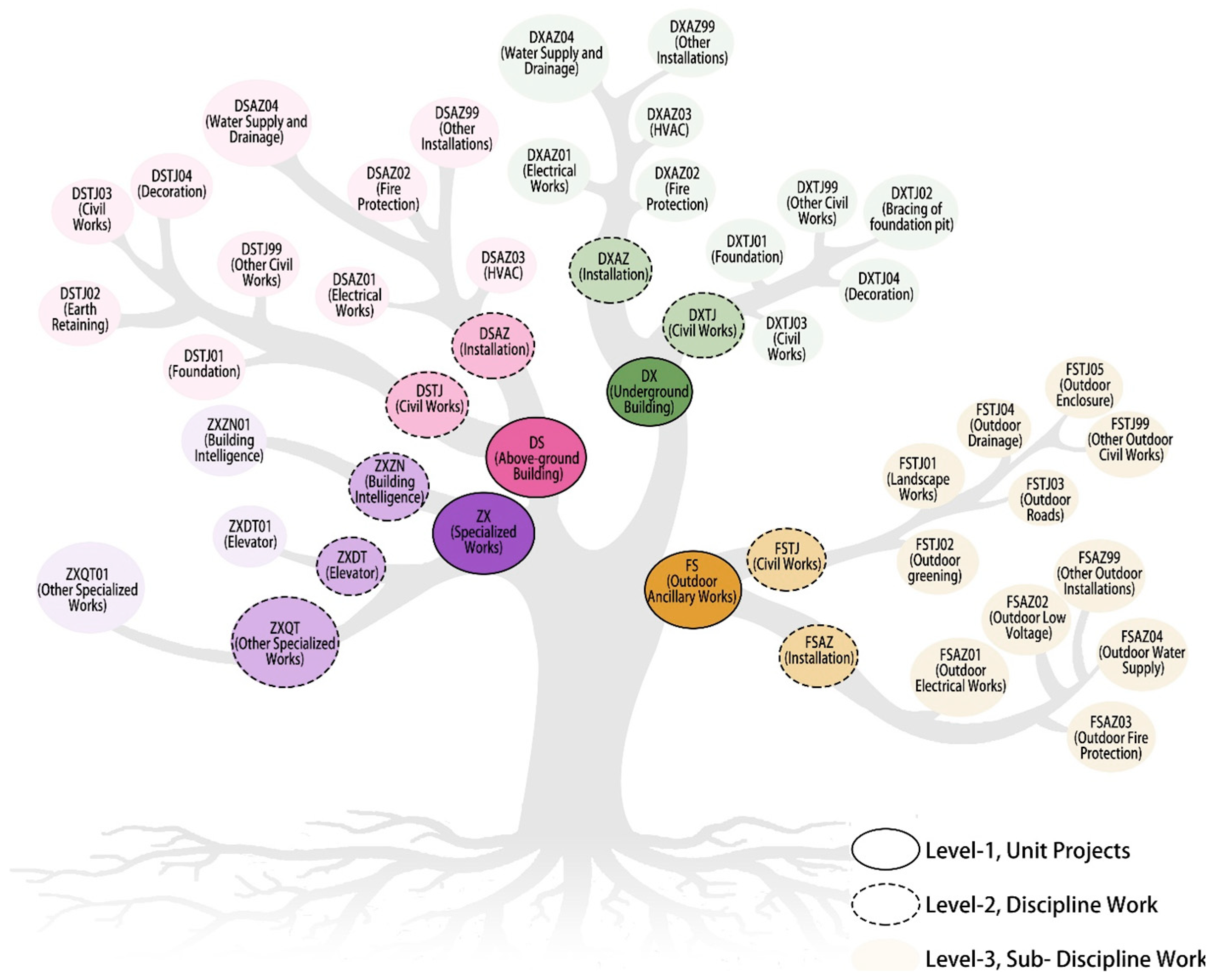 To achieve standardized cost classification, this study establishes a three-level taxonomy comprising unit projects, discipline work, and sub-discipline work, as shown in