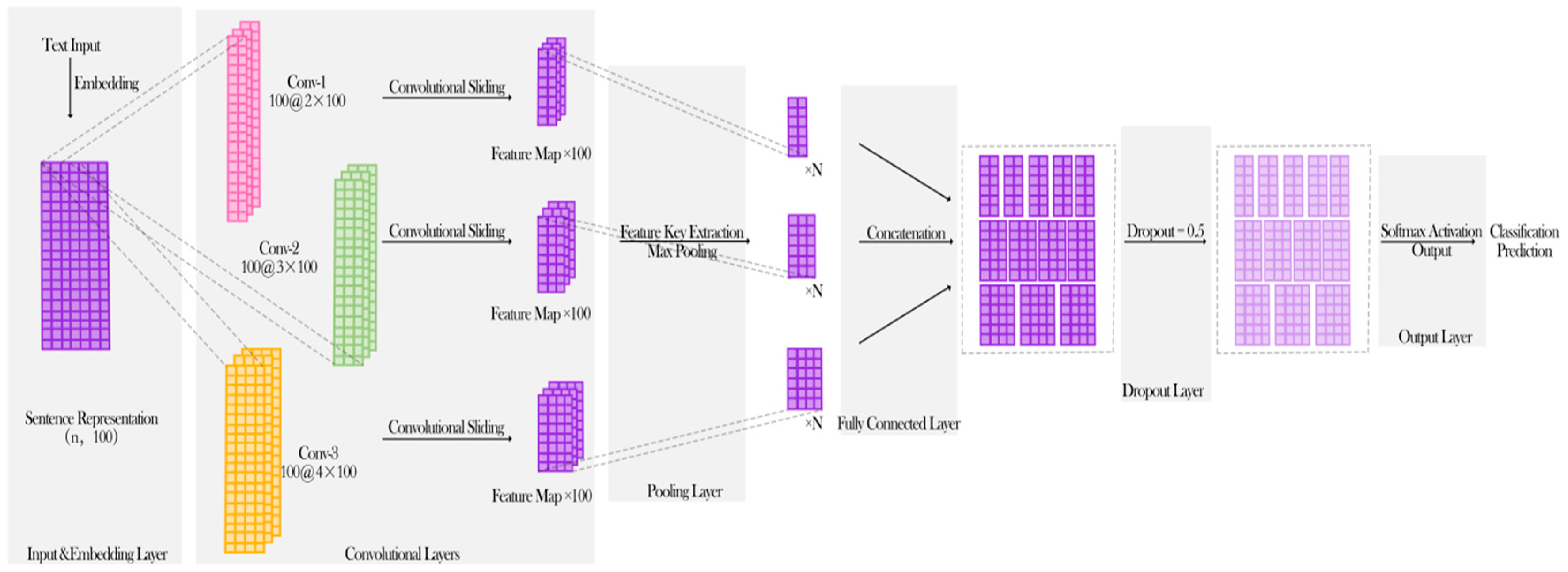 Figure 3) was selected as a representative convolutional neural network architecture for text classification, owing to its strong ability to capture local semantic features. The model first transforms the input text into an embedding space, where each token is represented by a dense vector that preserves semantic and syntactic information.