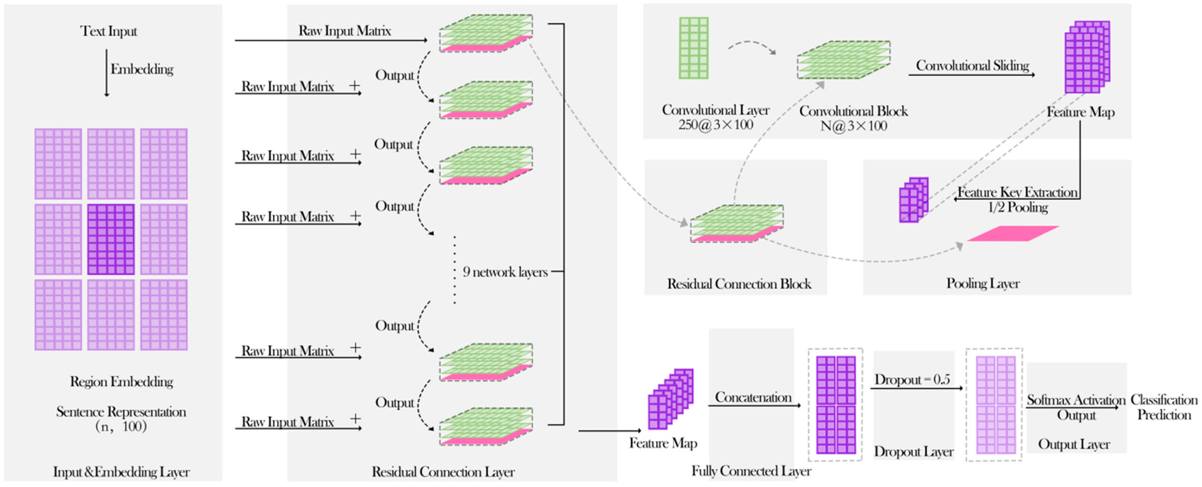 9]. Different categories of deep learning architectures exhibit complementary strengths in text classification: convolution-based models are effective for capturing local semantic patterns, deeper hierarchical networks enhance the representation of contextual information, and recurrent or sequence-oriented models are adept at learning long-range dependencies in textual data [