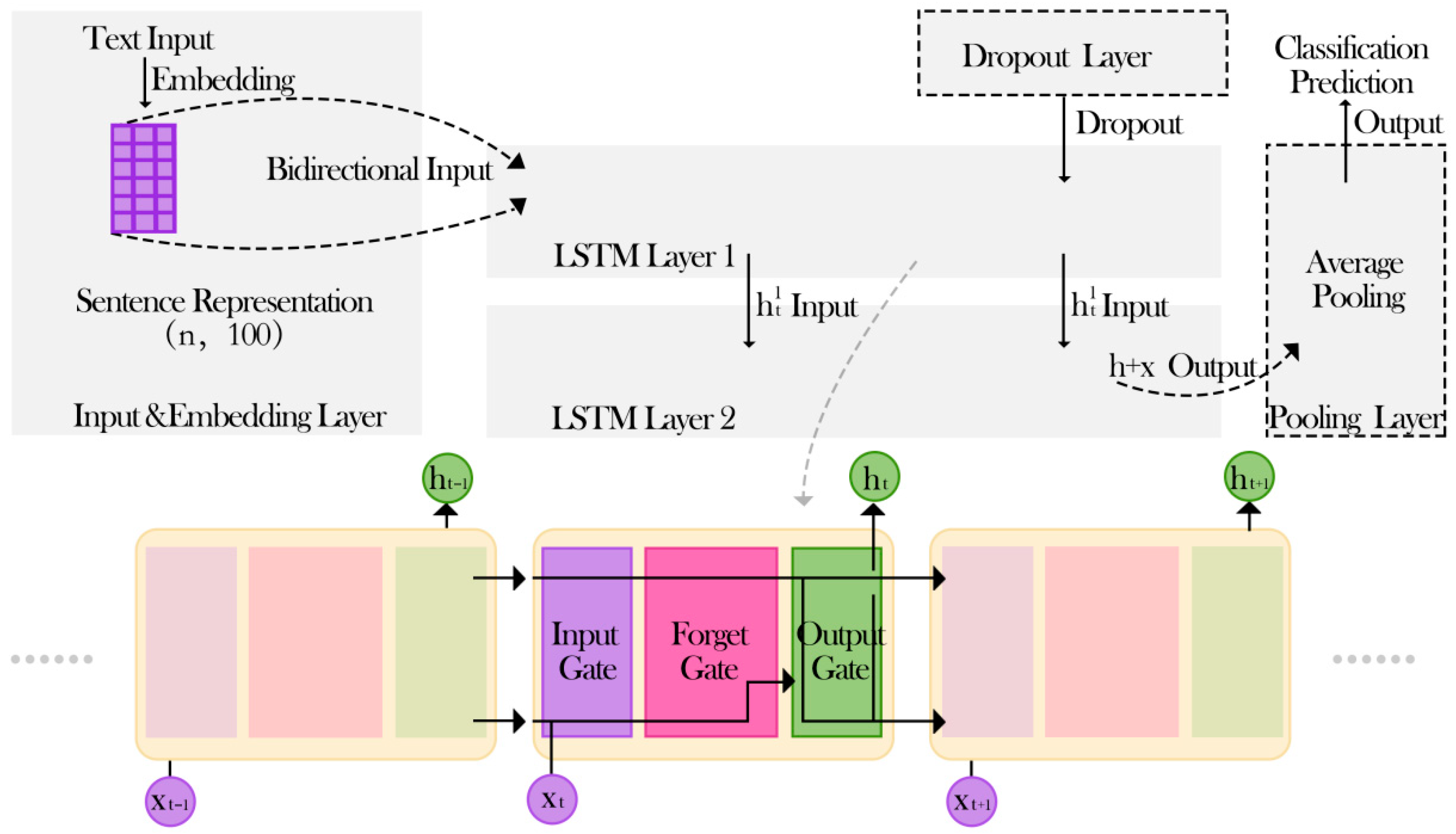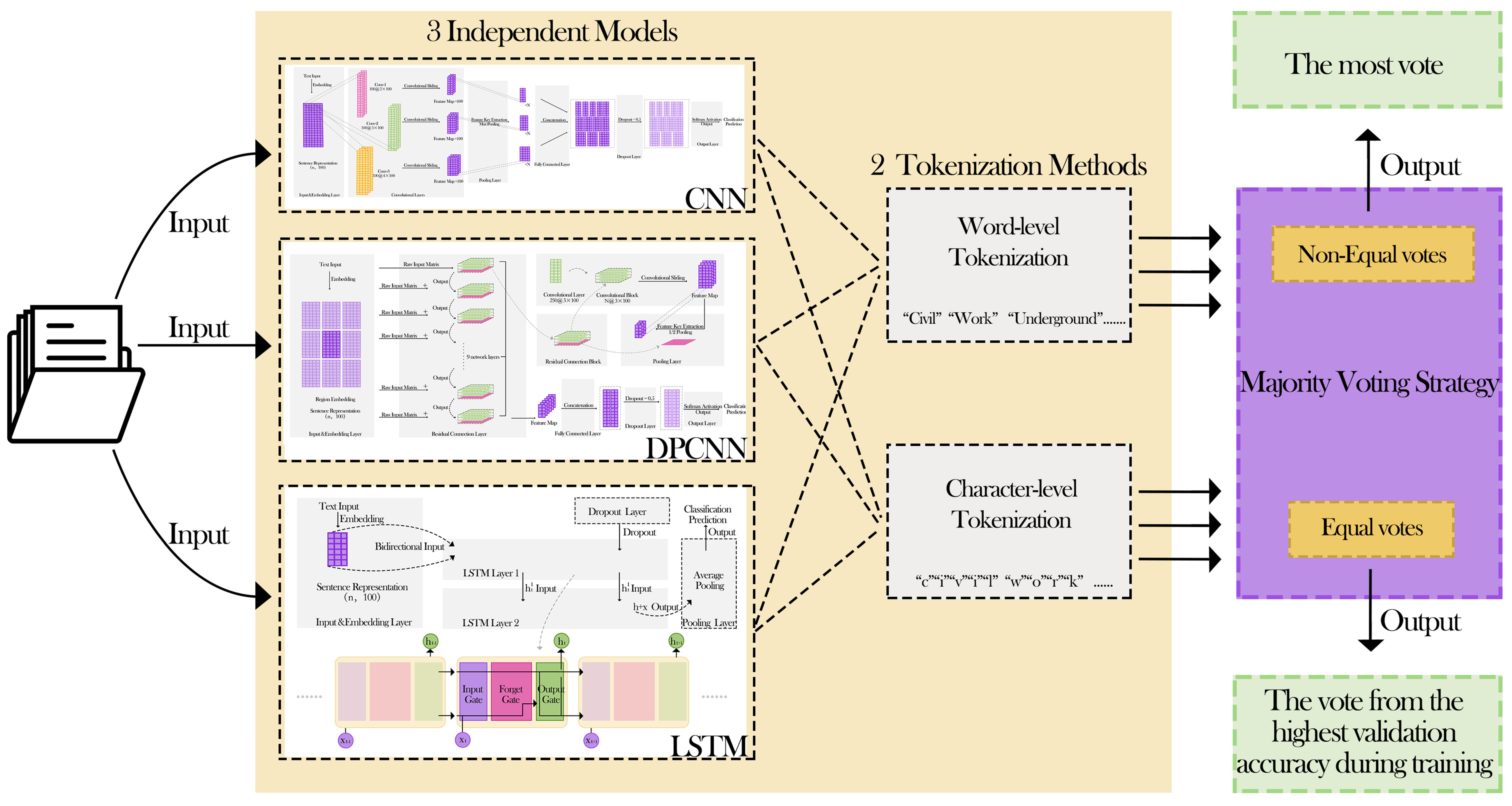 Three baseline deep learning architectures—TextCNN, TextDPCNN, and TextLSTM—were employed to capture complementary aspects of textual information. Each of these models was trained under two tokenization settings: character-level segmentation, which emphasizes fine-grained morphological patterns and alleviates out-of-vocabulary issues, and word-level segmentation, which preserves semantic units and enhances contextual interpretation. As a result, six independent classifiers were obtained.