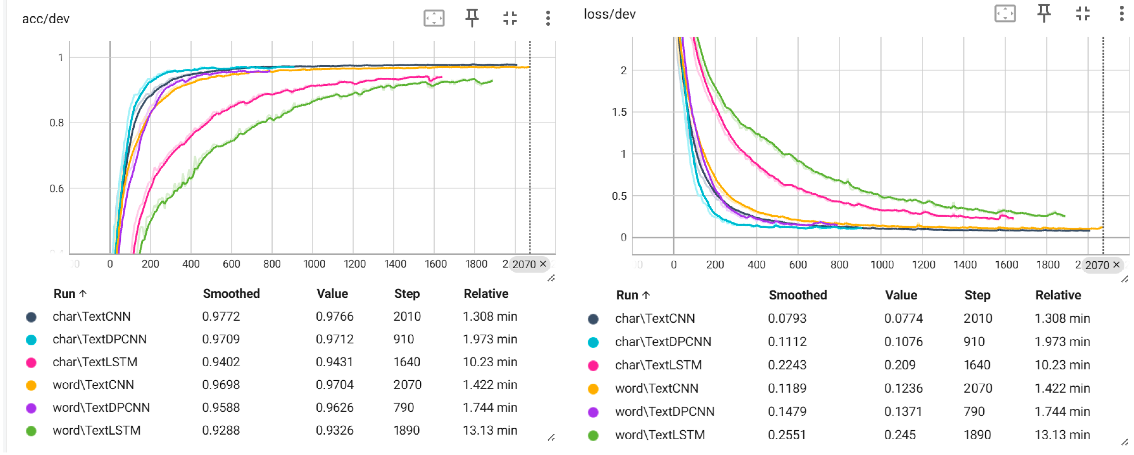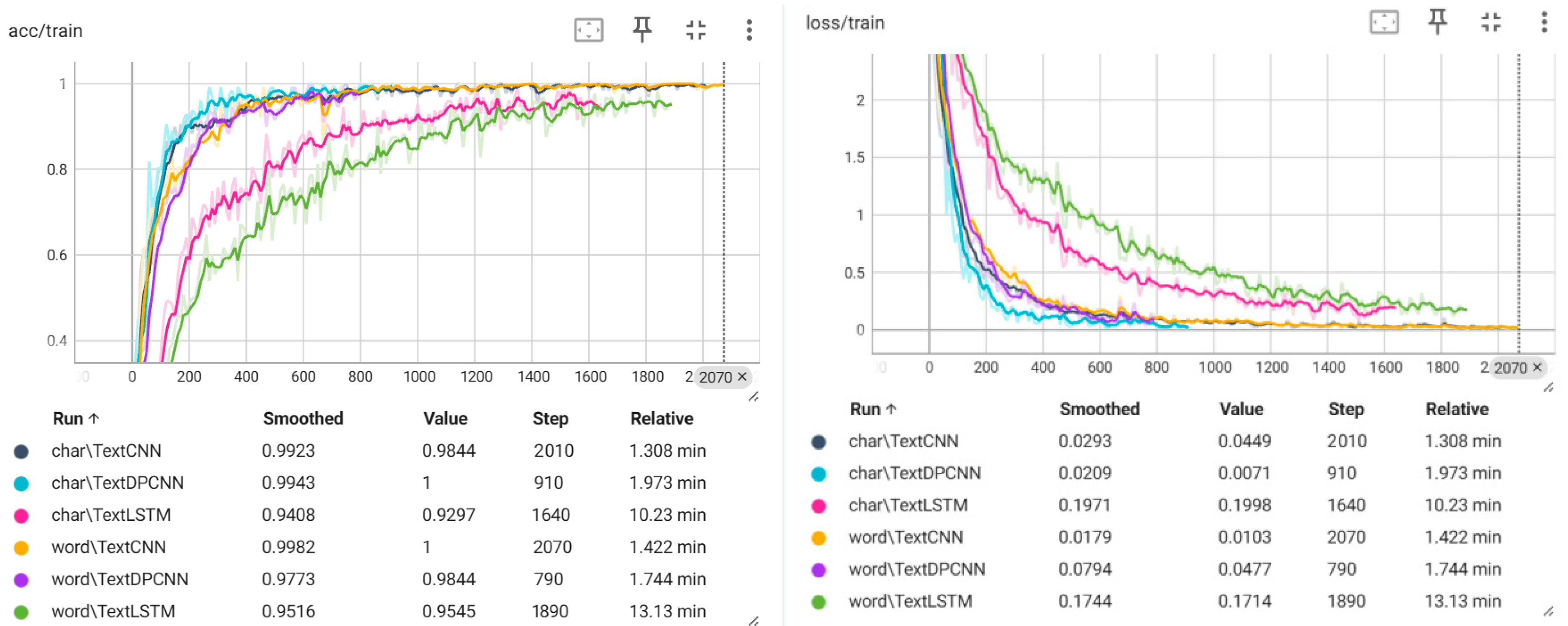 To evaluate the baseline performance of the independent models, three deep learning architectures—TextCNN, TextDPCNN, and TextLSTM—were trained and tested under both character-level and word-level tokenization. The results are presented in
