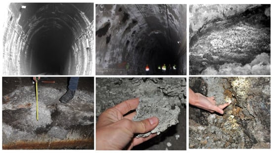 - Ma, K.; Long, G.; Xie, Y. Railway Tunnel Concrete Lining Damaged by Formation of Gypsum, Thaumasite and Sulfate Crystallization Products in Southwest of China. J. Cent. South Univ. 2012, 19, 2340–2347. [Google Scholar] [CrossRef]