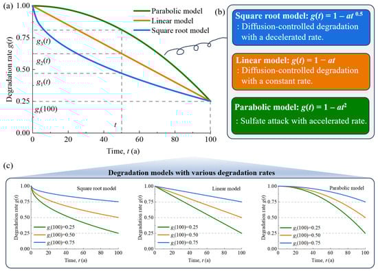 Degradation models of concrete lining: (a) Different degradation models, (b) Function of degradation models, (c) Different degradation models with various degradation rates.