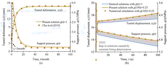 This section compares existing solutions and numerical simulations to verify the solutions of the coupled mechanics model proposed in the previous section. The solutions derived in this paper could be seen as an expansion of the research of Chu et al. [], who proposed a solution for a circular tunnel in Burgers viscoelastic rock. As shown in Figure 5a, the solutions presented in the present study are identical to those of Chu et al. [] for cases where degradation of concrete lining is not considered, i.e., g(t) = 1. Therefore, specific comparisons should be executed to preliminarily invalid solutions in this study, where the parameters employed are listed in Table 1 [,,,]. Chu et al. [] focused on the support forces during the construction stage under rock rheology; our research investigates the long-term mechanical response of the tunnel structure during its entire service life, considering the coupled effects of surrounding rock rheology and support system degradation. Therefore, our model incorporates a broader and more complex set of factors, leading to a significantly distinct scope and findings.