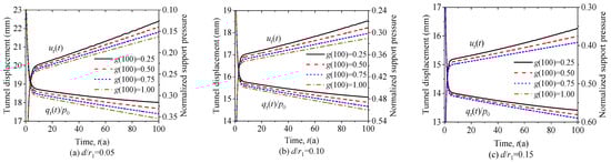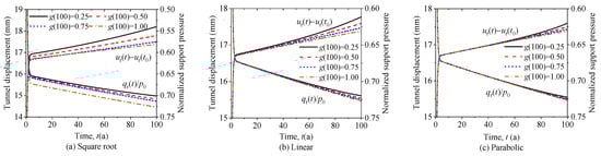 The degradation rate of the concrete lining can be represented by g(100), as mentioned in Section 2, where a smaller value of g(100) corresponds to a more considerable ultimate degradation degree, and g(t) = 1 indicates that the concrete lining does not deteriorate. Figure 6 shows the tunnel displacement and normalized support pressure according to the different degradation rates of the three degradation models. It can be seen that both tunnel deformation and support pressure grow with time under the long-term rheological loading effect of the surrounding rock. Meanwhile, the degradation of the concrete lining alters the dynamic interaction between the support and the surrounding rock. As the degradation of lining concrete reduces its ability to resist deformation, the tunnel deformation increases when the lining deteriorates. Also, the higher the degree of lining deterioration, the greater the growth rate of tunnel deformation and the lower the growth rate of support pressure. Additional accumulation of tunnel deformation is observed when the concrete lining has a larger degradation rate. Thus, a minor g(100) corresponds to a higher growth rate of the tunnel deformation, while the reduction in the concrete lining’s bearing capacity slows down the growth rate of the support pressure. The concrete degradation is minor when the degradation coefficient g(100) = 0.75; thus, the tunnel deformation and support pressure are close to the evolution law of the undeteriorated case. Both the degradation rate and degree increase with g(100) = 0.5, so there is a significant increase in the tunnel deformation at the exact moment compared to the case of g(100) = 0.75, while there is a specific reduction in the support pressure. This finding is due to the reduced stiffness of the concrete lining diminishing the ability to carry loads, resulting in a gradual slowing of the rate of load increase. As the degradation rate and the degree of concrete lining increase further, the tunnel deformation significantly increases with g(100) = 0.25 compared to g(100) = 0.5, while the support pressure decreases further. It can be seen that the stiffness of the deteriorated concrete lining decreases, tunnel deformation increases significantly, and support pressure shows an unloading effect compared to the non-deteriorated case.