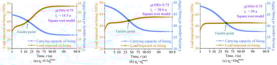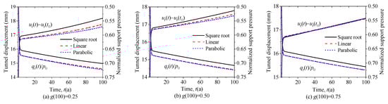 To identify the influence of degradation models of concrete lining on tunnel deformation and support pressure, the degradation rate g(100) should be kept constant. Herein, the time-dependence curves of tunnel deformation and support pressure for g(100) = 0.25, 0.5, and 0.75 are presented in Figure 7. As mentioned in Section 2, the Square root model has a gradually decreasing degradation rate over time, the Linear model has a uniform degradation rate, and the Parabolic model has an increasing degradation rate over time. The order of the concrete lining’s degradation rate at the identical moment is Square root model > Linear model > Parabolic model. Due to the significant rheological loading effects on the surrounding rock in the early stages of tunnel service, the dynamic interaction between the lining and the surrounding rock is most significantly affected when the concrete matches the degradation pattern of the Square root model because of its higher degradation rate in the early stages. As shown in Figure 7, the tunnel deformation under different degradation models is the Square root model > Linear model > Parabolic model; otherwise, the support force is the Square root model < Linear model < Parabolic model. Moreover, the larger the concrete degradation rate is, the more significant the difference between the tunnel deformation and the support pressure under different degradation models. From the analysis, it can be seen that the degradation rate of the lining concrete and the degradation model have a significant effect on the long-term mechanical response of the tunnel structure, so it is of great significance to grasp the actual service state of the lining concrete to clarify the evolution law of the long-term mechanical characteristics of the tunnel structure in operation. Under the Square Root, Linear, and Parabolic models, the surrounding rock displacements are 18.19 mm, 17.77 mm, and 17.60 mm at t = 100 years, respectively. This indicates that the displacement in the Square Root Model is 3.4% higher than that in the Parabolic Model. Meanwhile, the corresponding normalized support pressure are 0.701, 0.719, and 0.723, respectively, showing that the support force under the Square Root Model is 3.2% lower than that under the Parabolic Model.