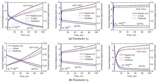 The mechanical characteristics of the surrounding rock are not only related to its physical properties but also closely related to the tunnel service environment, leading to the complexity and uncertainty of the long-term loading effect of the surrounding rock. Herein, the influence of the surrounding rock’s time-dependent characteristics on the lining structure’s long-term loading effect is investigated by altering four parameters of the Burgers model. Figure 9 shows that four parameters exert different impacts on the long-term stability of tunnel structures. The value of parameters , , and are the same in Table 1, where the degradation rate g(100) is set as 0.5. As presented in Figure 9a, the variation of ηm dramatically influences interaction performance between the surrounding rock and concrete lining. The growth rates of both the tunnel deformation and the support pressure are more significant when , and the variability of the tunnel deformation between the three degradation models gradually increases with time. In addition, the long-term growth rate of tunnel deformation and support pressure decreases as the parameter ηm increases, and the variability of tunnel deformation decreases among the three degradation models, whereas the variability of support pressure increases among different degradation models. It can be seen that a smaller value of ηm results in a more extensive tunnel deformation and support pressure. These findings are consistent with the results presented by Do et al. (2020) []. Because of the more significant long-term effect of smaller values of ηm, a more pronounced difference in rock displacement can be expected among the three degradation models.