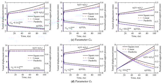 Figure 9b shows that the dashpot of the Kelvin element (ηk) exerts a remarkable effect on the long-term responses of rock displacement and support pressure. A smaller value of ηk results in a shorter transient stage, which yields more significant initial deformation and less long-term displacement. A more prolonged rock attenuation creep stage as the parameter ηk increases is associated with a more considerable tunnel deformation and support pressure. Therefore, it leads to a gradual decrease in the incremental share of the total amount of tunnel deformation and support pressure induced by long-term loading effects. Figure 9c presents the effect of parameter Gm variation on the long-term evolution of the tunnel deformation and support pressure. It can be seen that the parameter Gm controls the short-term deformation characteristics of the surrounding rock, but its influence on the long-term rheological effect of the surrounding rock is not significant. However, the smaller value of Gm results in a more significant difference in tunnel deformation among the three degradation models. In the diagrams shown in Figure 9d, the variation of Gk plays a prominent role in the long-term effect. Decreasing the value of Gk results in a faster accumulation and a more immense final value of the pressure on lining structures. Moreover, a higher value of Gk leads to an effective growth rate of rock displacement and support pressure after ten years. Therefore, the higher the value of Gk, the more significant the difference in tunnel deformation among the three degradation models.