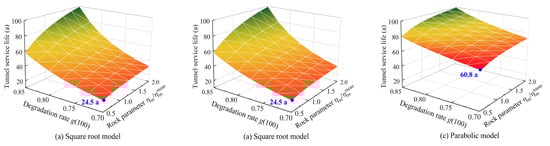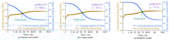 Based on existing research, the effect of the degradation of strength and stiffness of concrete is illustrated using three typical parametric representation models, as shown in Figure 4. The square root function represents a diffusion-controlled degradation process and concrete carbonation with a decreasing degradation rate over time [,], and the linear function has a constant degradation rate in strength and stiffness [,]. In addition, concrete is subjected to an accelerated degradation process because of sulfate attack, defined by a parabolic function []. As data to quantify the variability in degradation rate is insufficient, each function is assumed to be deterministic. Alternatively, the degradation rate may vary inside the concrete lining; after that, it is necessary to investigate the effects of degradation rates and different degradation models on the long-term stability of tunnels. For example, different degradation models for various degradation rates are shown in Figure 4. In Figure 4b, the parameter a is the degradation coefficient, and the units of different degradation models are different.