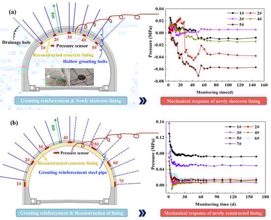 Figure 13 depicts the evolving loads and support capacity in tunnels. Since failure often arises from the coupling of these two factors, both must be considered in safety evaluation. Current practices, which often treat the support and rock mass separately, fail to address their interactive nature—a key reason behind frequent tunnel damage. As shown in Figure 14, two treatment measures for lining damage are adopted for an operation tunnel in Zhejiang Province []. In scheme A, hollow grouting bolts with a 4 m length were employed to reinforce the surrounding rock in the tunnel arch, where a layer of shotcrete structure was applied to the lining surface to enhance the integrity of the lining in this part. Moreover, the pressure between the shotcrete layer and the original lining indicates that the newly added layer bears little rock load. In addition, grouting reinforcement steel pipes of 4 m in length were adopted to enhance the integrity of the surrounding rock in scheme B, as shown in Figure 14b. Considering the severe cracking of the lining structure in this zone, a new lining structure was constructed to replace the old one. We also found that the stresses in the secondary lining stabilized 15 days after installation, and the pressure at different locations remained low.
