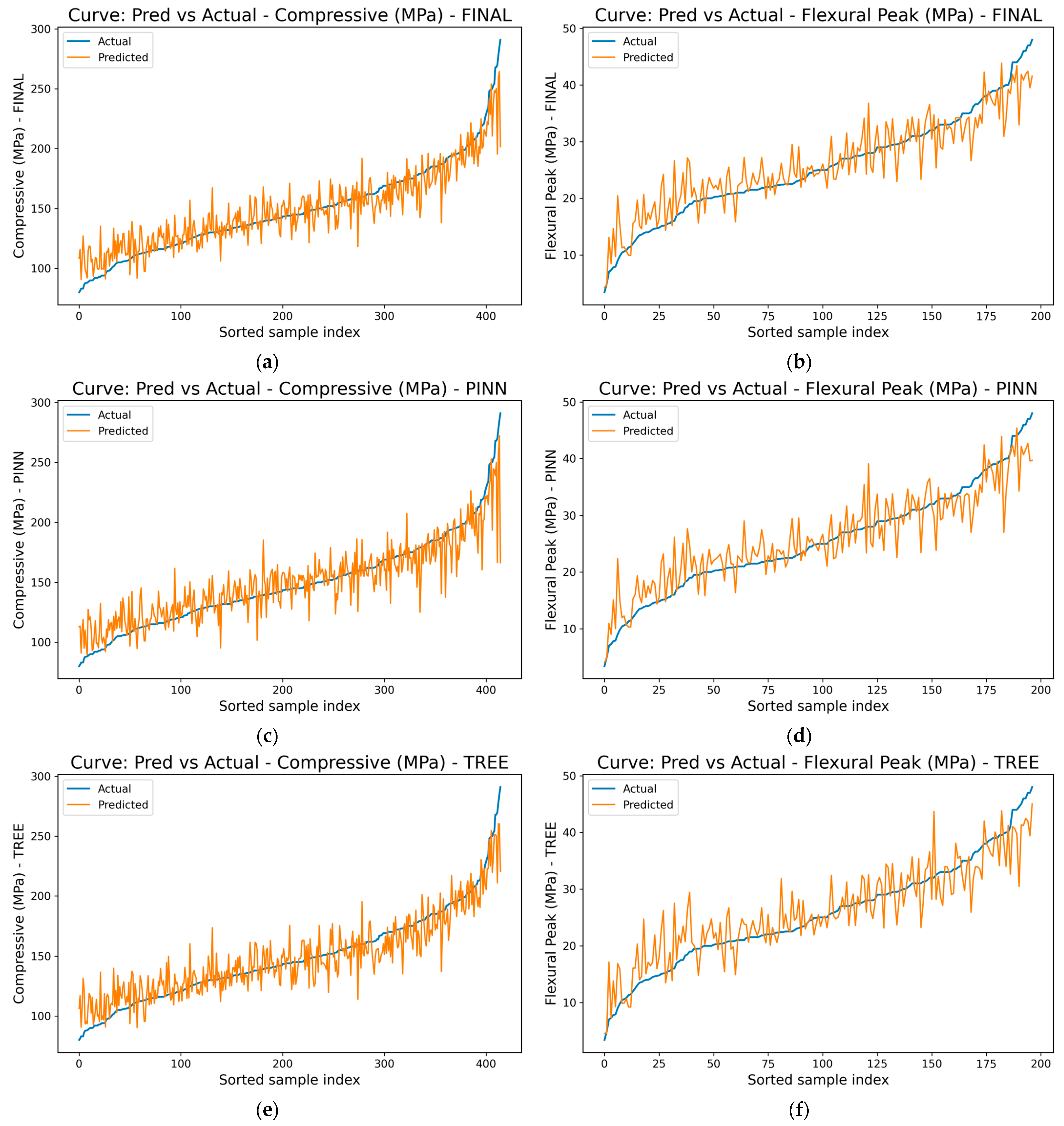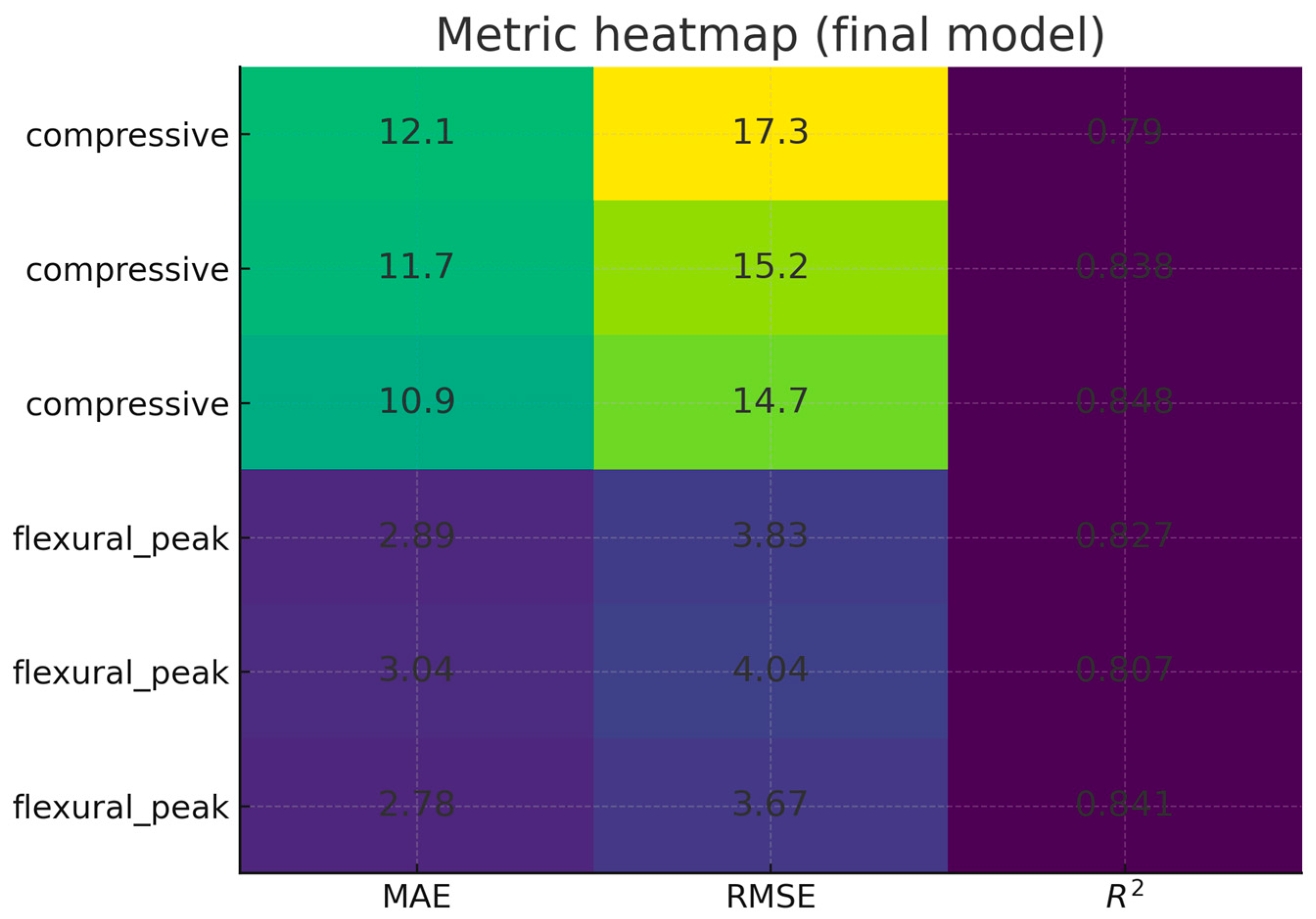 - The convex blend of PINN and HGBT consistently outperformed individual models, achieving an MAE/RMSE/R2 of 10.9/14.7/0.848 for compressive strength and 2.78/3.67/0.841 for flexural strength, thereby improving accuracy and robustness across tasks.