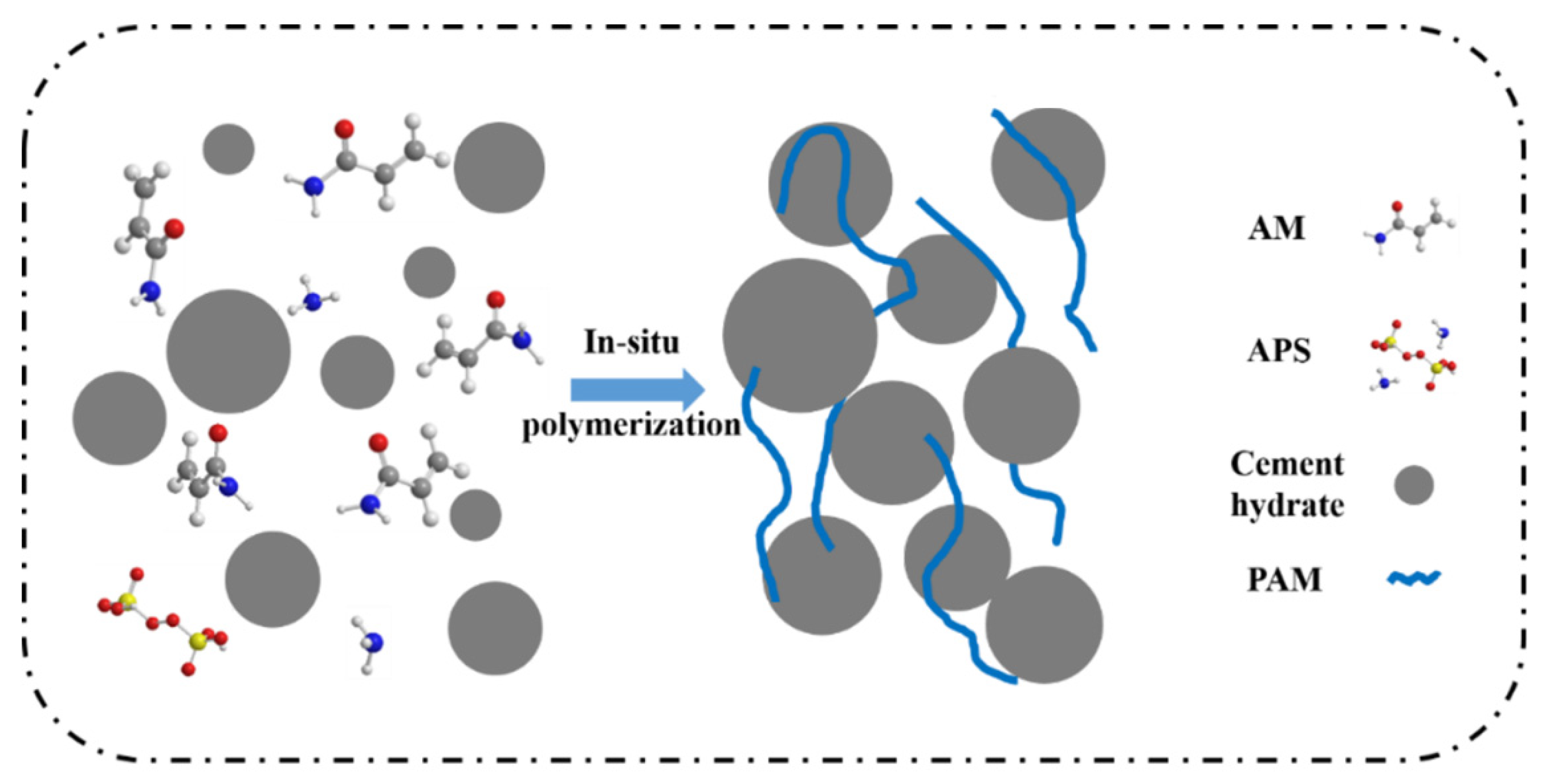 Figure 1. Prior to the cement hydration, the monomer was mixed to achieve a homogeneous distribution. After that, a certain amount of initiator was introduced to the matrix for the initiation of the polymerization. The polymerization reaction was subsequently triggered alongside hydration, leading to the formation of a PAM network that connects and binds the hydration products [