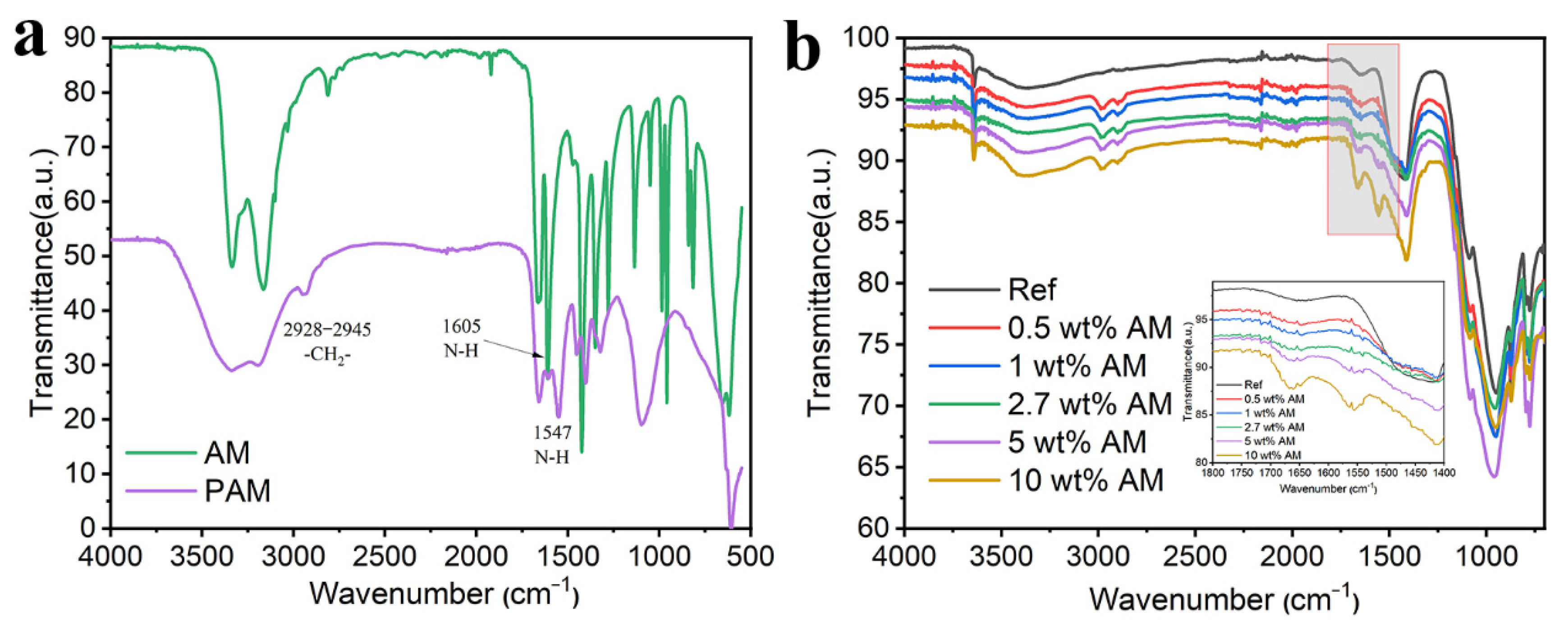 Figure 3a presents the FTIR spectra of pure AM and PAM, with the chemical groups corresponding to the peak positions annotated in the figure. It is notable that the formation of PAM is identified by the characteristic peaks of the methylene group around 2945–2928 cm