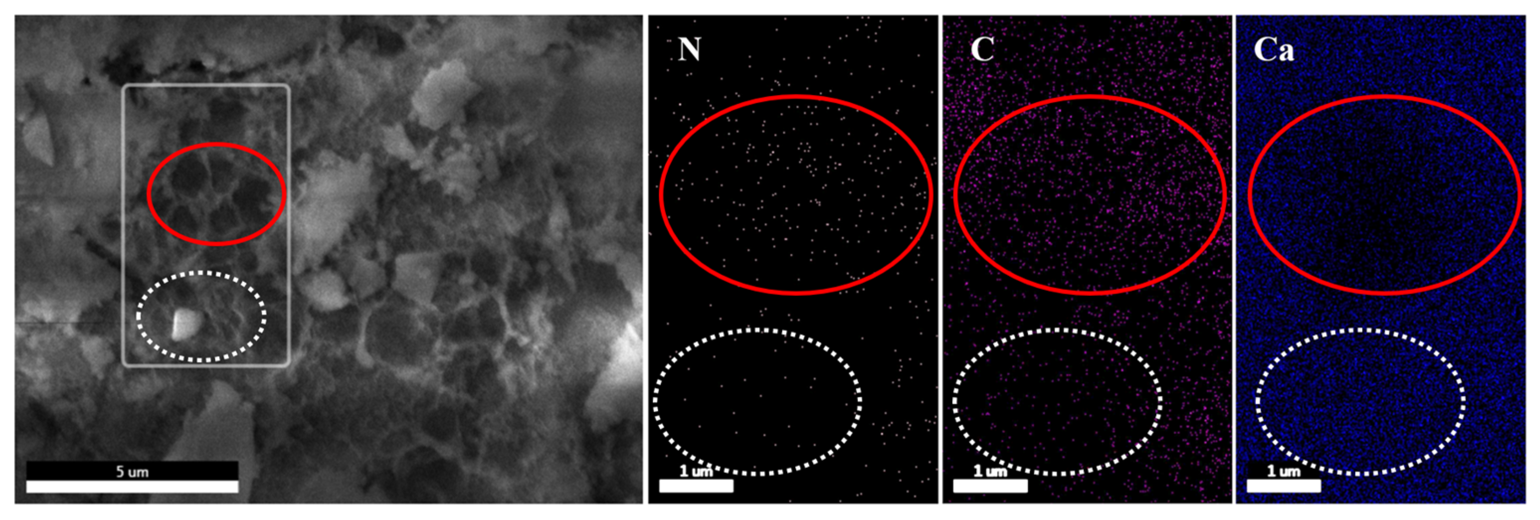 Figure 6 shows the SEM image of the hydration products of cement under the condition of in situ polymerization. The image reveals the formation of a connected region surrounding the hydration products. Energy-dispersive X-ray spectroscopy (EDS) mapping was performed on this area. Since it is located within a concave region of the sample, the intensity of the electron signal was relatively low. By careful observation of the element distribution maps, both element N and C (main elements in AM) show detectable signals within the red circle on the image, while the Ca (element in hydrates) signal is relatively weak. Conversely, within the blue circle, a distinct hydration product is clearly observed in the SEM image and the Ca signal is strong, while the signals for N and C are both weak in the element distribution maps. These observations confirm that the in situ polymerization formed a spatial polymer network structure among the cement hydration products.