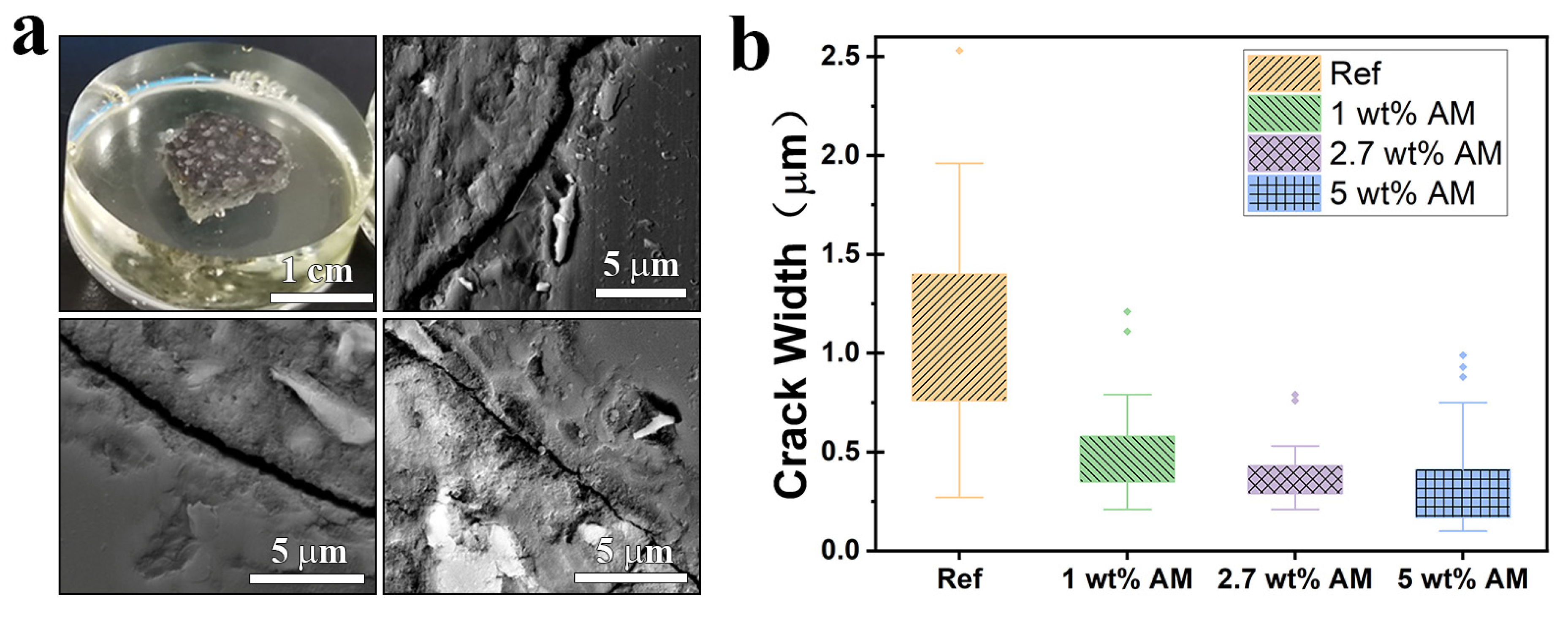 Figure 8b shows the statistical results of the crack widths for different samples and the width of each crack was measured 60 times. The cement sample without the in situ polymerized AM system exhibited significantly larger crack widths. However, with the addition of the in situ polymerized AM system, the crack width was markedly reduced, decreasing from 1.16 ± 0.81 µm (97% CI) to 0.49 ± 0.29 µm (95% CI). Moreover, as the AM concentration increased, the crack width could be further reduced. This experiment provides additional evidence that the in situ polymerization system enhances the interfacial bonding strength and contributes to pore filling.
