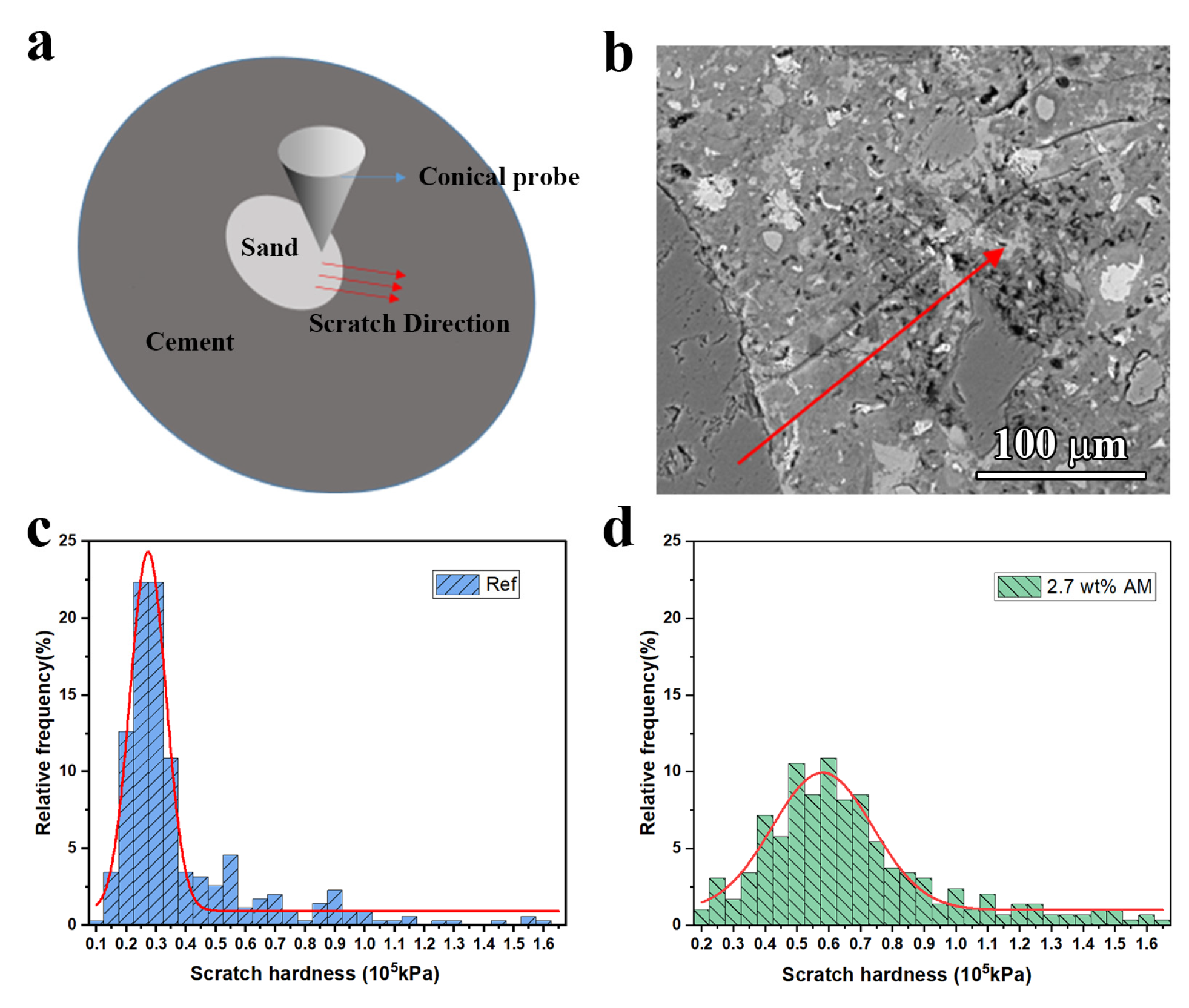 Figure 9. The results indicate that, after in situ polymerization modification, the scratch hardness distribution of the interfacial transition zone within the sample becomes more dispersed compared to the unmodified sample. Meanwhile, the peak value in the hardness distribution increased from 0.25 ± 0.02 × 10