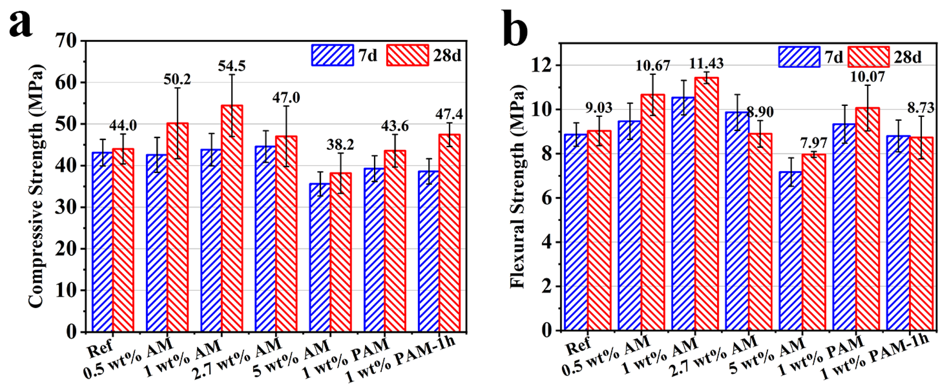 Figure S3), consequently reducing the compressive strength. As the AM dosage increased from 1 wt% to 5 wt%, the compressive strength showed a slight decreasing trend. In contrast, the direct addition of PAM and the delayed addition of PAM did not show obvious enhancement (strength levels similar to the reference sample). Notably, the sample with 1 wt% in situ polymerized AM not only showed a modest increase in compressive strength, but also an improvement in flexural strength. Its 28d flexural strength increased from 9.03 ± 0.67 MPa (reference) to 11.43 ± 0.27 MPa, representing an increase of 26.58%. Specimens with AM dosages greater than 1 wt% experienced a decrease in flexural strength, which can be attributed to their inhibition of early-age hydration [