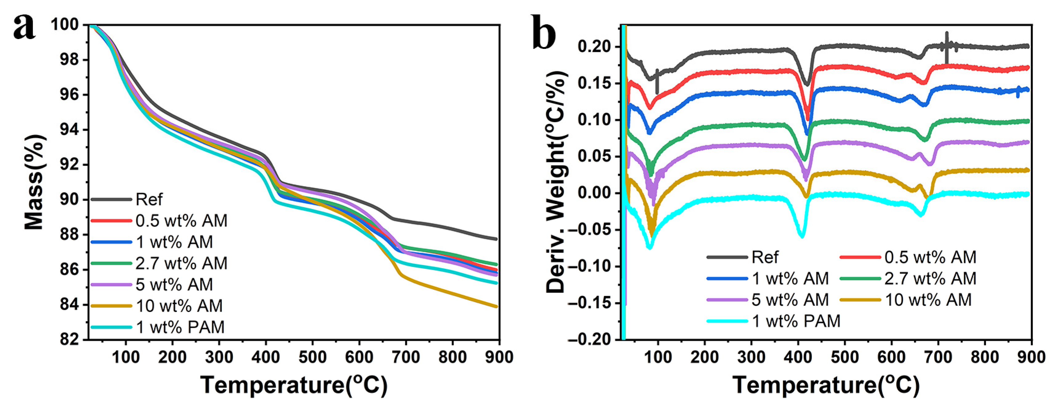 are the relative molecular masses of CH and water, respectively. Considering that PAM itself undergoes mass loss in this temperature range, the mass of PAM resulting from the assumed complete polymerization of all added AM was subtracted within this interval. The calculated data of the CH content and AM concentration is listed in
