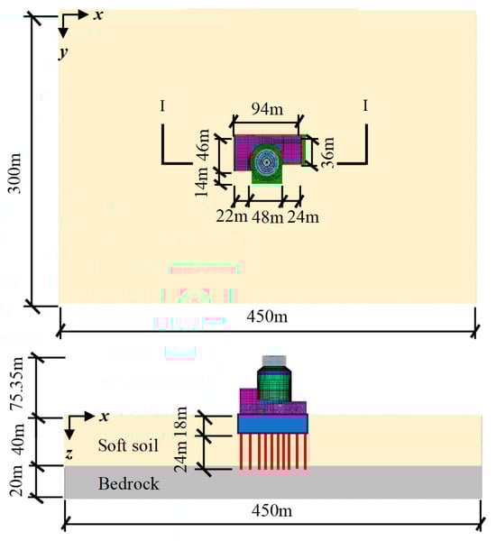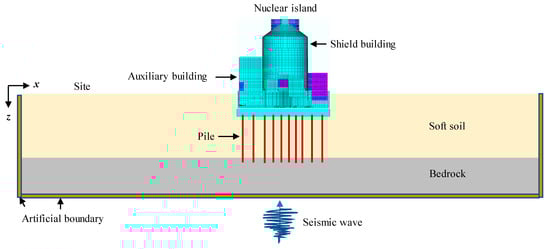 For the sake of seismic safety and cooling reliability, most existing pressurized water reactor NPPs are constructed on coastal sites with favorable geological conditions and competent bedrock foundations []. As nuclear power continues to expand, suitable coastal bedrock sites are becoming increasingly limited, and future NPPs are likely to be located in inland regions characterized by more complex geological conditions, including soft-soil deposits. Compared with bedrock or stiff-soil sites, soft soils typically exhibit lower bearing capacity, higher compressibility, and stronger amplification of ground motion, which may result in excessive settlement and reduced seismic performance of superstructures []. To address these challenges, pile foundations have been widely adopted in NPP engineering, as they enhance the bearing capacity of the subsoil, reduce overall settlement, and improve the global seismic performance of nuclear structures [,,]. Consequently, pile-supported foundations show significant potential for inland nuclear projects, particularly in deep soft-soil areas.