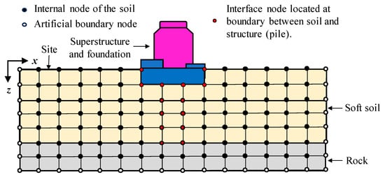 At the base and lateral boundaries of the soil domain, the multi-transmitting formula (MTF) boundary is implemented to simulate wave radiation and energy dissipation in the far field []. The time-domain displacement responses obtained from the free-field analysis at the boundary nodes are then extracted and applied as input motions for the subsequent SSI simulations.