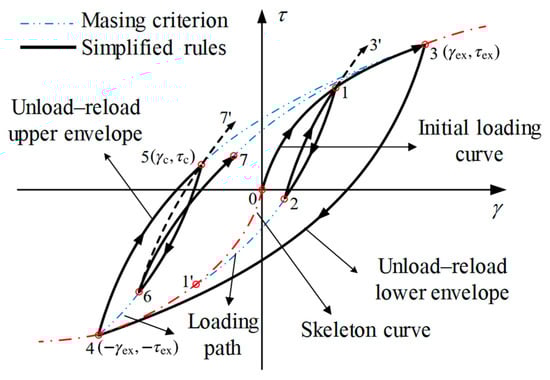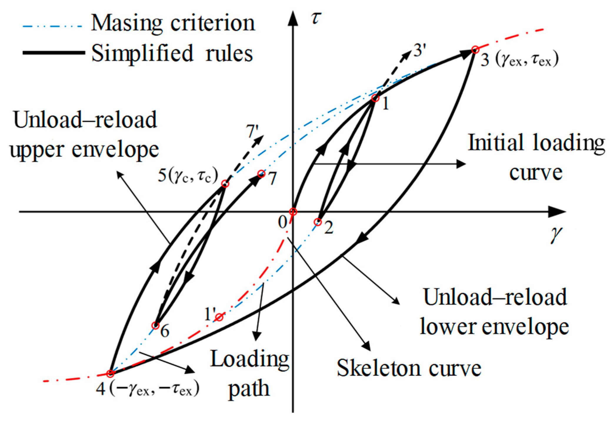 - Intersection with the skeleton curve: When the loading–unloading path intersects the skeleton curve before stress reversal, the subsequent hysteretic curve follows the extended Masing rule along the upper skeleton branch.