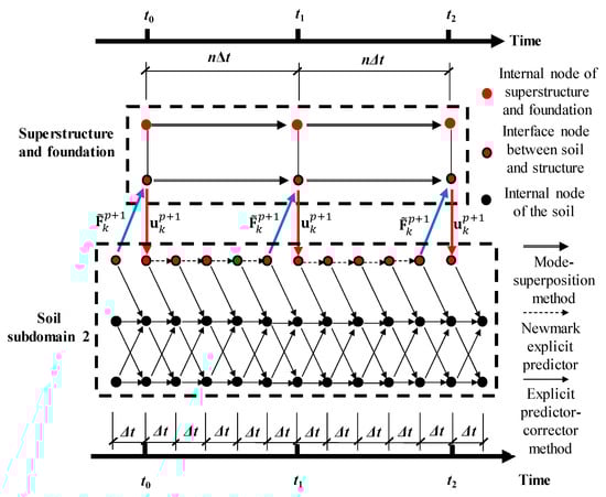 The SSI coupling is achieved through data exchange between process 2 and process 4, enabling the use of an inter-field parallel scheme to further improve computational efficiency. In the structural partition, the dynamic response is evaluated using the mode-superposition method, and the time step is determined by the desired accuracy. In contrast, the soil partition adopts an explicit integration scheme, whose time step is restricted by the stability condition and is therefore considerably smaller. Using this smaller step size for both partitions would unnecessarily reduce the structural computation efficiency and increase memory demand. To address this issue, different time steps are adopted for the two partitions: the structural time step is set to be n times the soil time step. The predicted value of is obtained using the soil displacement at time as the external load of the structure at time . The structural response at time is then calculated via the mode-superposition method, after which the resulting displacement and velocity are transferred to the corresponding soil interface nodes. For the interval to , and under the assumption of constant acceleration within each soil time step , the displacement of the soil–structure interface nodes at intermediate soil time levels is estimated using Equation (28):
