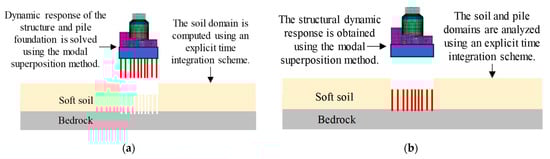 Building on the PASSI framework, an efficient partitioned parallel method is developed for nonlinear SSI analysis of pile-supported NPP structures. The soil domain is modeled using an explicit integration scheme incorporating nonlinear behavior derived from the Davidenkov skeleton curve combined with a modified Masing rule [,], enabling realistic representation of hysteretic damping and modulus degradation. The structural domain, including the foundation and superstructure, is analyzed using the modal superposition method to efficiently evaluate dynamic response under linear assumptions. Two explicit–modal partitioning strategies are considered: (a) the soil domain is solved explicitly, while the pile–structure system is modeled as an integrated body using modal superposition; (b) the soil and piles are solved together using explicit integration, while the superstructure is analyzed through modal superposition.