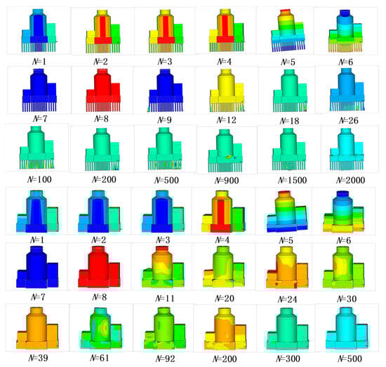 Considering that the main structure of an NPP is relatively stiff and designed to remain elastic under a design-basis earthquake (DBE), it is reasonable to assume linear behavior for the pile foundation and superstructure. Under these conditions, the mode-superposition method can be employed to efficiently evaluate the structural dynamic response, with structural damping represented through modal damping ratios. This approach often offers higher computational efficiency compared with direct time-integration methods. It should be noted, however, that the linear assumption may become less accurate under beyond-design-basis earthquakes or other extreme loading scenarios that could induce significant structural nonlinearity. In such cases, the proposed partitioned algorithm remains applicable, and the mode-superposition method can be replaced by a direct time-domain integration scheme (e.g., the Newmark-β method [,]), with nonlinear constitutive models introduced for both the structure and the soil.