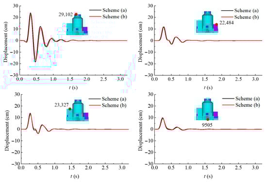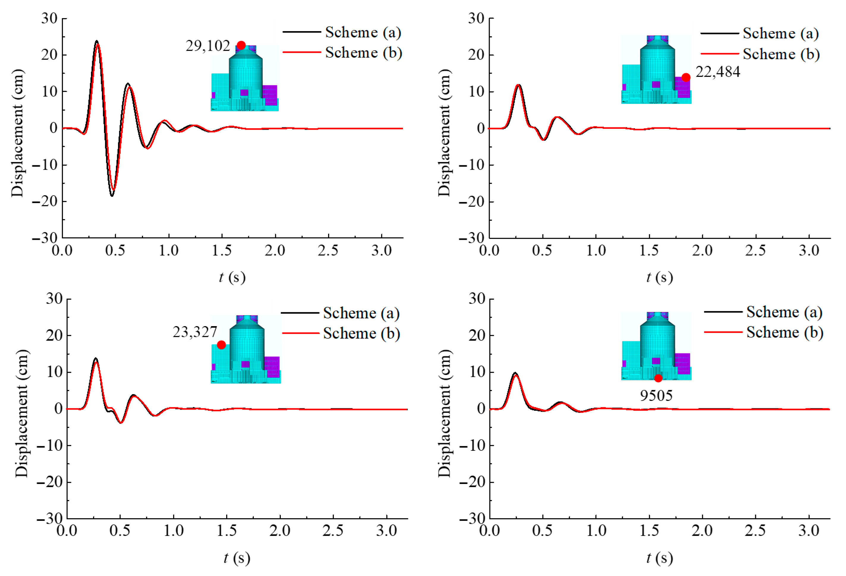 - The computations are performed on a workstation with an Intel Core i7-14700 processor (16 threads) and 32 GB of memory. The NPP model includes 45,810 elements and 35,588 nodes, and the site model contains 993,195 elements and 1,213,104 nodes, using four MPI processes. Two partitioning schemes are evaluated: Scheme (a) with 1000 structural modes and Scheme (b) with 500 modes. Both schemes produced comparable responses, but Scheme (b) reduced computation time from approximately 293 h to 88 h. The lower efficiency of Scheme (a) is due to the increased structural degrees of freedom from the coupled pile foundation, which reduces overall stiffness and modal frequencies, requiring more modes in the modal superposition analysis. This highlights that selecting a scheme that minimizes the computational cost of the structural partition can significantly improve efficiency without compromising accuracy. The explicit pile–soil coupled approach demonstrates higher computational efficiency and better suitability for large-scale nonlinear SSI analyses.