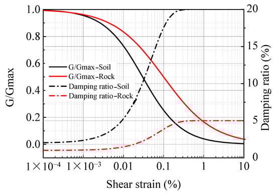 where and are the Rayleigh damping coefficients, which depend on the material damping ratio and the predominant frequency of the input motion. Assuming that the Poisson’s ratio remains constant during deformation, the nonlinear soil behavior is captured by updating the shear modulus and damping ratio at each time step.