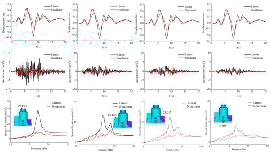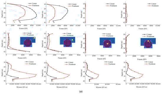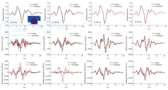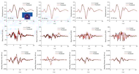 As shown in Figure 17, under nonlinear soil conditions, the x-direction displacement, shear force , and bending moment of the corner pile (Pile 1) beneath the auxiliary building exhibit notable deviations from the linear analysis results. (1) Displacement response: The peak displacement at the pile head decreases by 38.78% compared with the linear case. With increasing depth, the difference between the nonlinear and linear responses gradually diminishes, and their values converge near the pile toe. (2) Shear force response: The peak shear force at the pile head is reduced by 40.50% relative to the linear analysis. Along the pile depth, the peak shear force initially decreases and then increases, reaching its maximum at the pile toe. The discrepancy between nonlinear and linear results gradually reduces with depth, with the nonlinear peak at the pile toe being 16.42% lower than the linear counterpart. (3) Bending moment response: The bending moment distribution follows a different pattern from displacement and shear. Differences between nonlinear and linear results are minor at the pile head and pile toe but become pronounced at mid-depth. At m, the nonlinear peak bending moment is approximately seven times higher than the linear result.