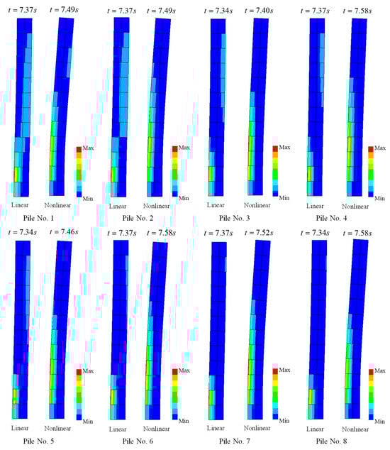Table 7 lists the maximum values of the first and third principal stresses (σ1 and σ3) for Piles 1–8. When soil nonlinearity is considered for, the maximum principal stresses of all piles increase relative to the linear case, indicating that nonlinear soil behavior amplifies local stress concentration within the pile shafts and leads to a more critical stress state. Among the different pile locations, the center pile beneath the containment building (Pile 3) exhibits the lowest maximum principal stresses for both σ1 and σ3, followed by the edge piles (Piles 4–7), while the corner piles beneath the auxiliary building (Piles 1 and 8) sustain the highest principal stresses. This pattern aligns with the distributions of axial force, shear force, and bending moment in Figure 19, further confirming the close coupling between the internal force distributions and principal stresses along the pile shafts.