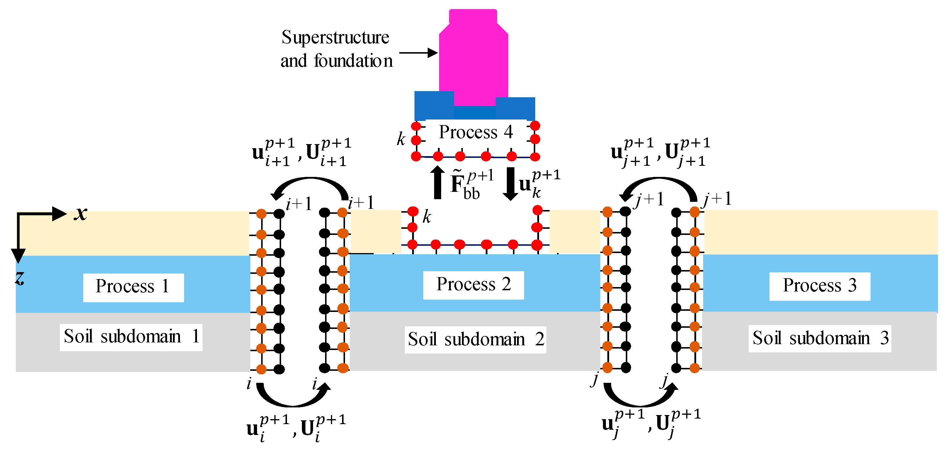 | 3 | Soil update: Update the dynamic shear modulus based on , and compute the soil node displacements using Equations (1)–(6), (24) and (25) (executed in parallel on processes 1–3); |