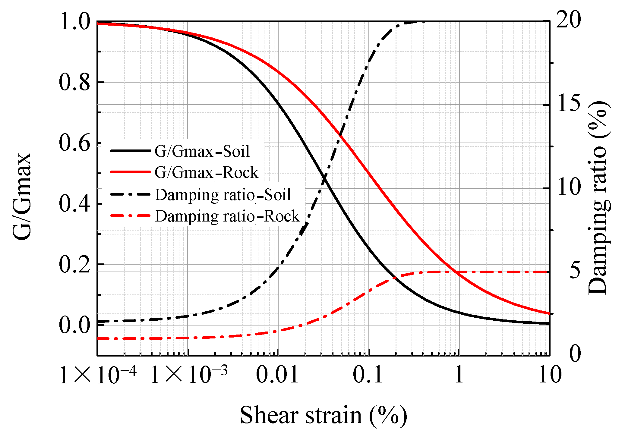 - Hardin, B.O.; Drnevich, V.P. Shear modulus and damping in soils: Design equations and curves. J. Soil Mech. Found. Div. 1972, 98, 667–692. [Google Scholar] [CrossRef]