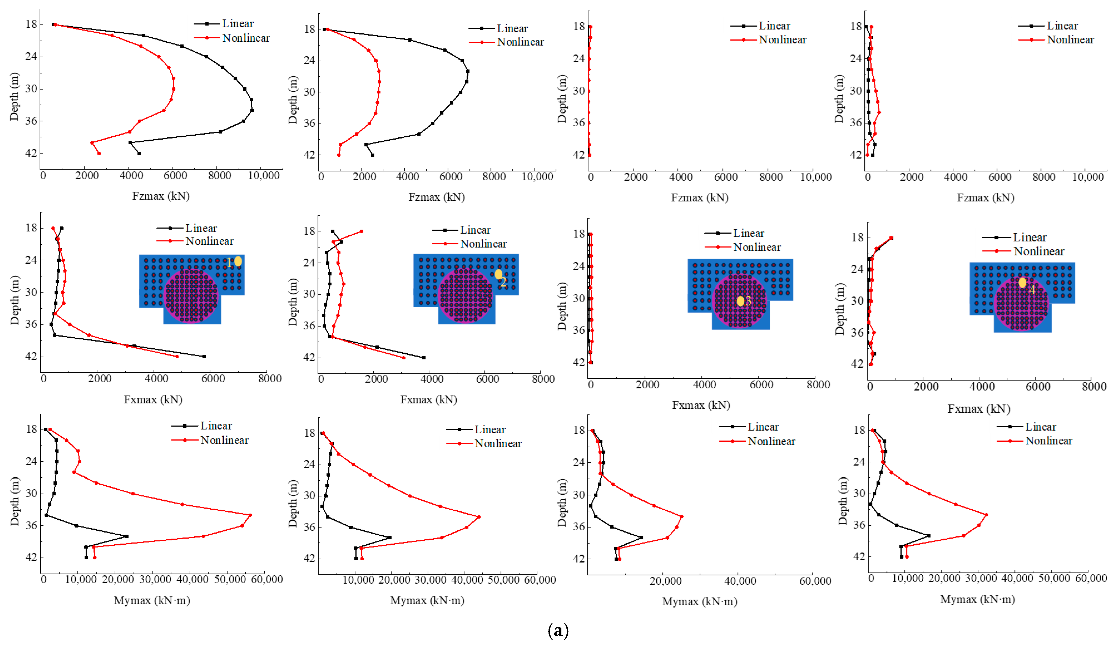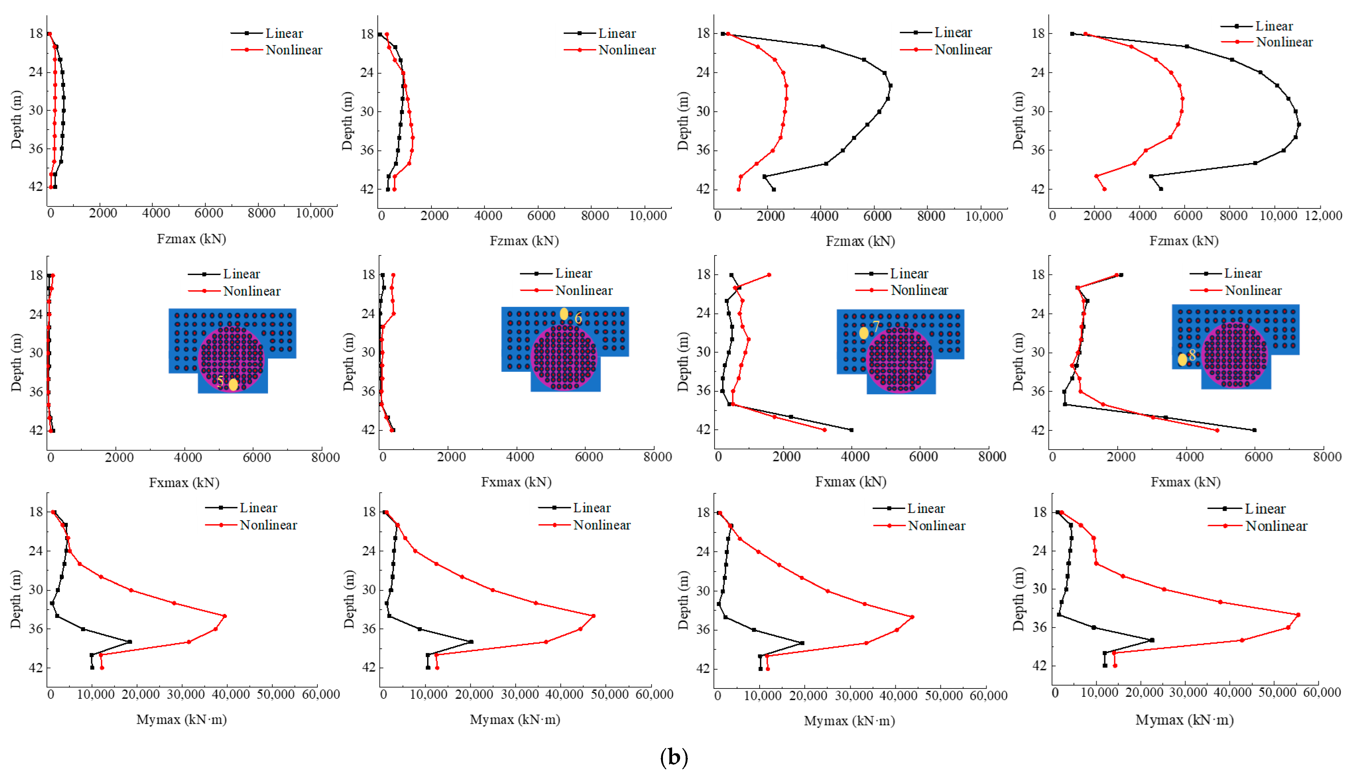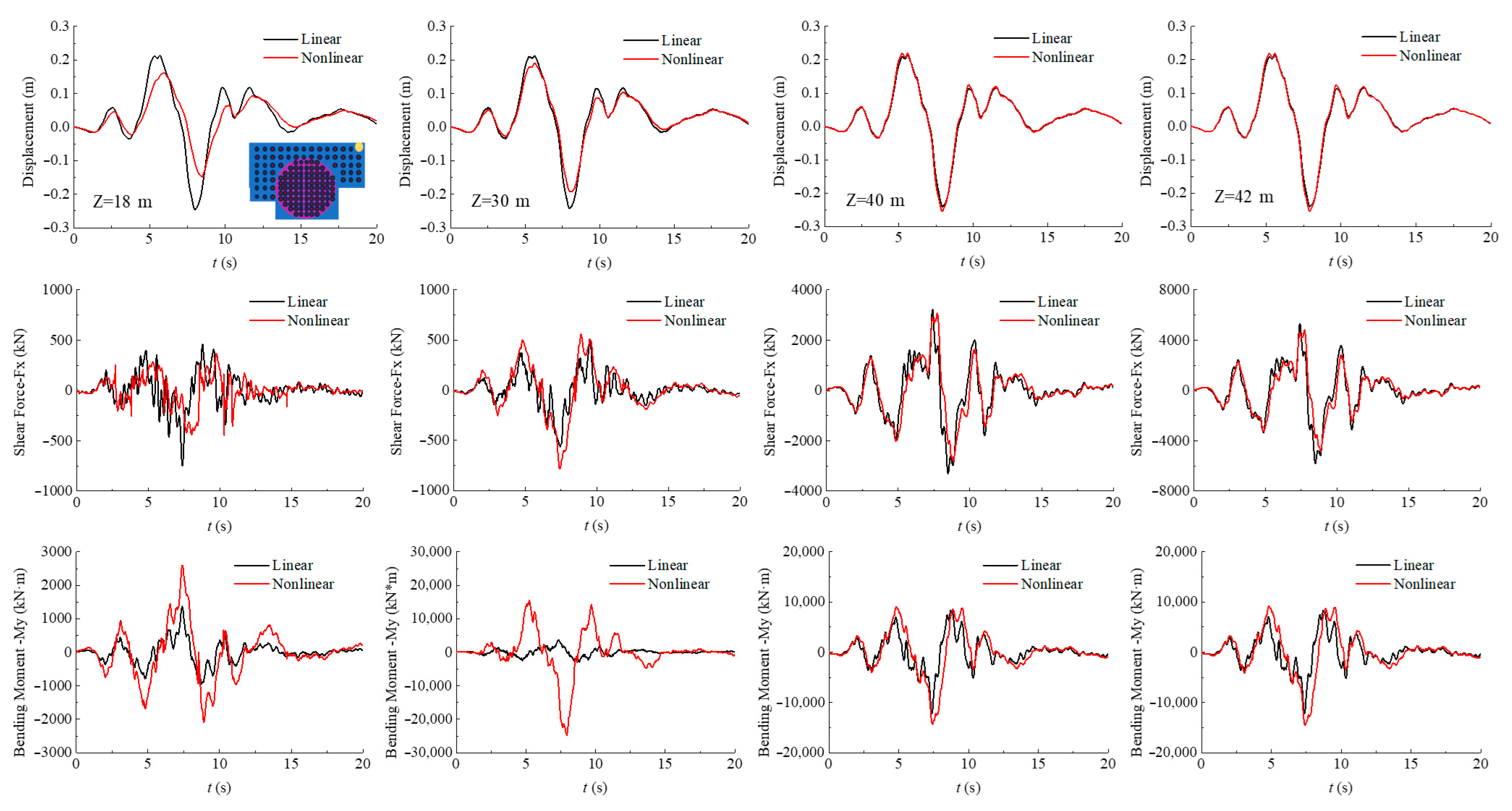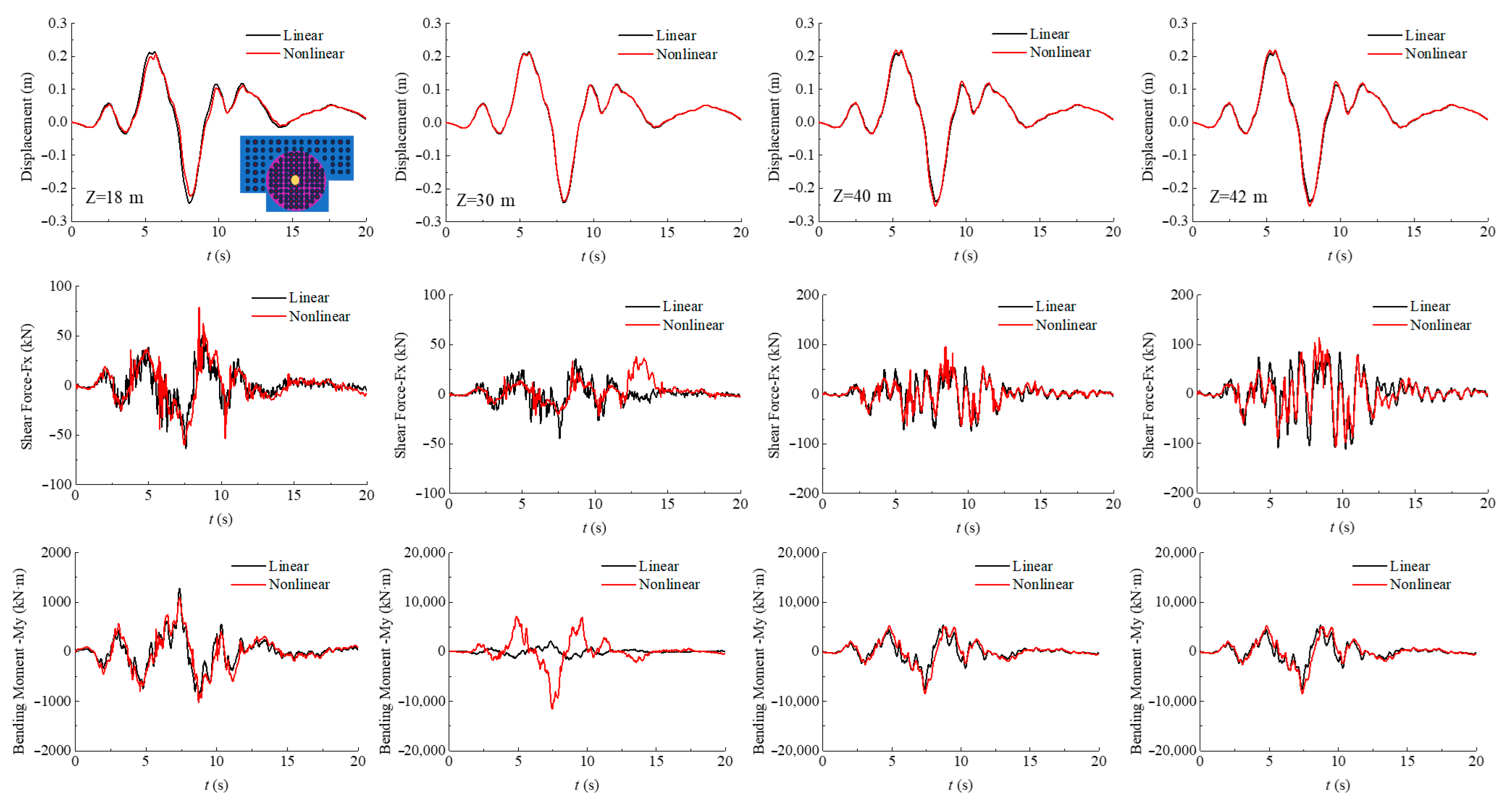 - Using the efficient explicit pile–soil scheme, dynamic analyses under RG1.60 seismic input show that soil nonlinearity significantly influences the seismic response of the NPP structure, leading to reductions and delays in displacement, acceleration, and spectral peaks, with the dominant frequency shifting toward lower values. Meanwhile, nonlinear effects modify the load transfer mechanism within the pile foundation, causing reconfiguration of the shear force path, amplification of bending moments, and upward expansion of principal stress concentration zones, which may increase the damage potential in locally weak pile regions. From an engineering perspective, these findings highlight the importance of accounting for soil nonlinearity in seismic assessments of pile-supported NPPs. The observed response trends can inform foundation design, structural evaluation, and mitigation strategies, ensuring more reliable predictions of seismic performance. Incorporating such quantitative and physically based interpretations strengthens the scientific impact and practical relevance of the proposed partitioned SSI framework for large-scale nonlinear analyses.